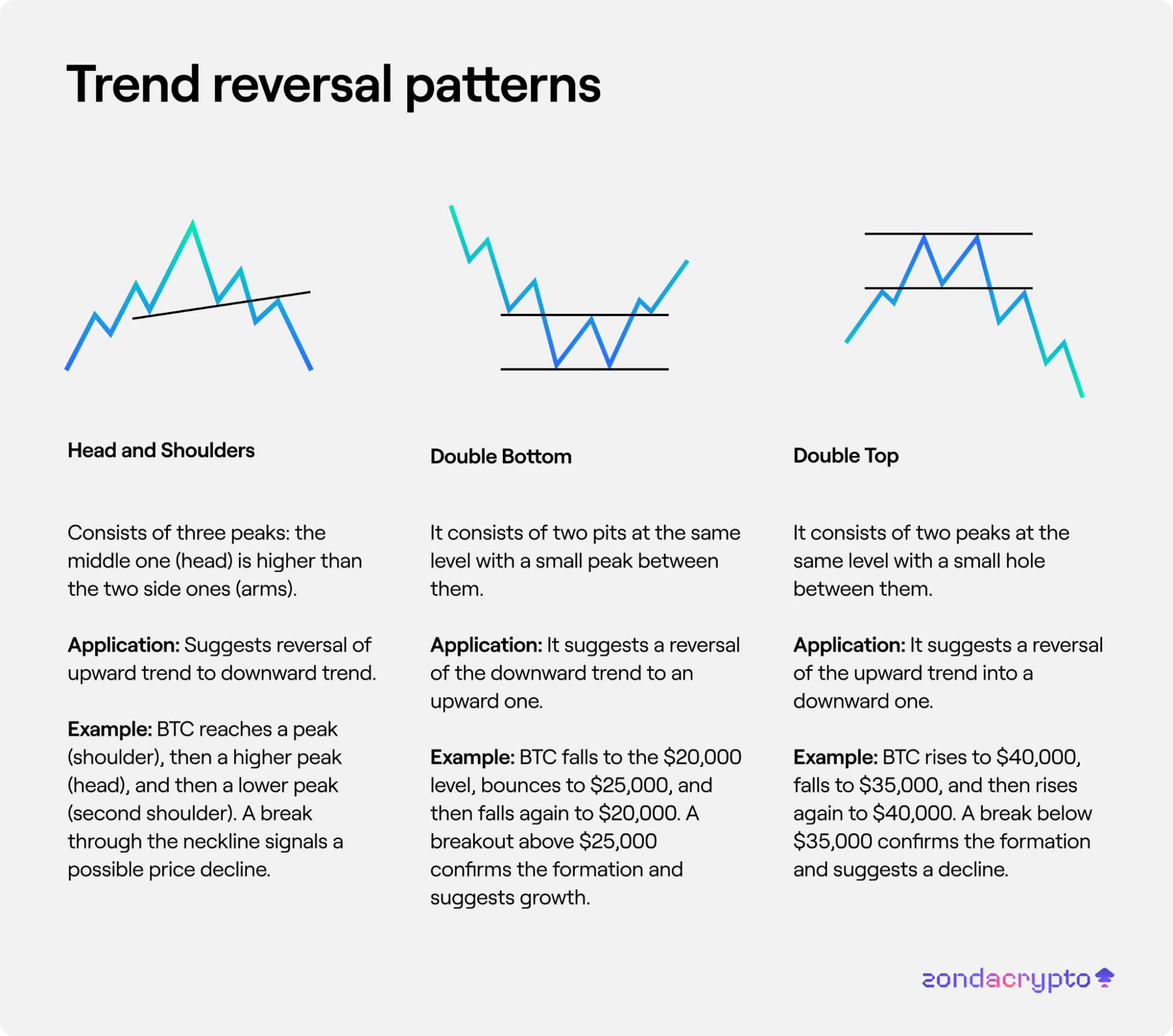 Example: BTC reaches a peak (shoulder), then a higher peak (head), and then a lower peak (second shoulder). A break through the neckline signals a possible price decline.