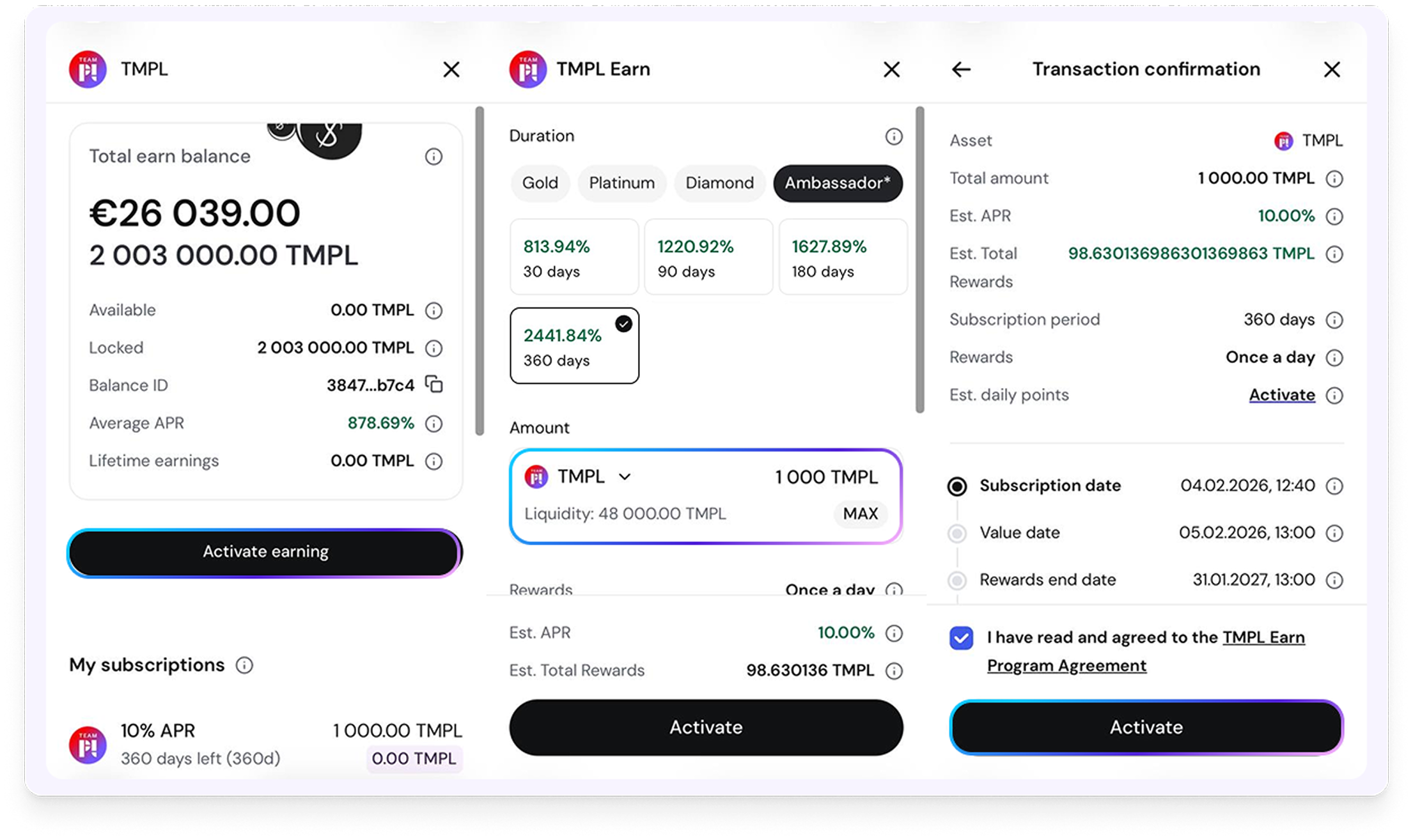 Enter the number of tokens you want to lock in the amount box; you can also use the MAX button to allocate all available tokens. You will see a summary of the TMPL Earn plan, the duration of your subscription, the estimated rewards, and the dates when your locked tokens will return to your wallet. Check that you have read T&C of Earn program and click “Activate.”