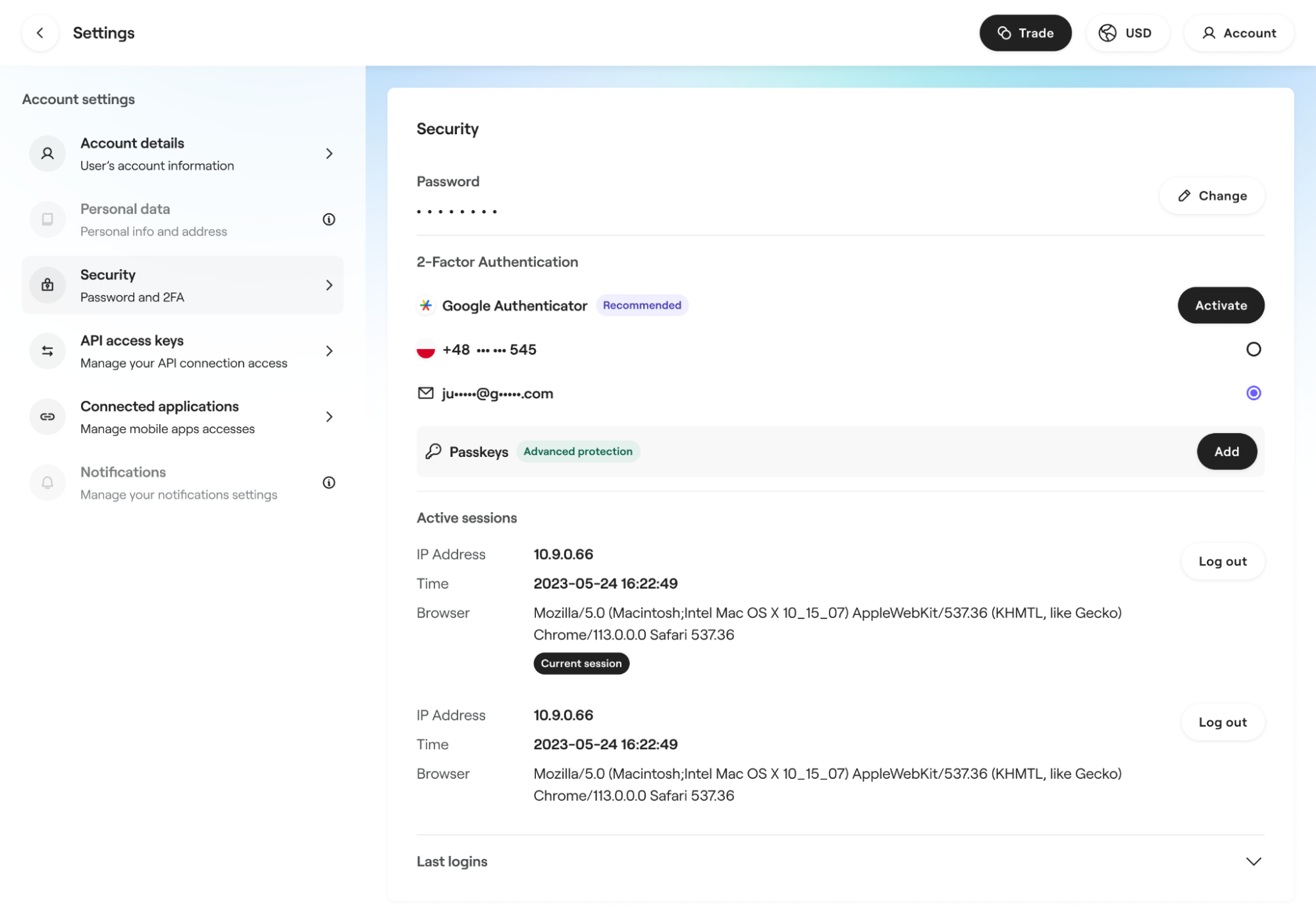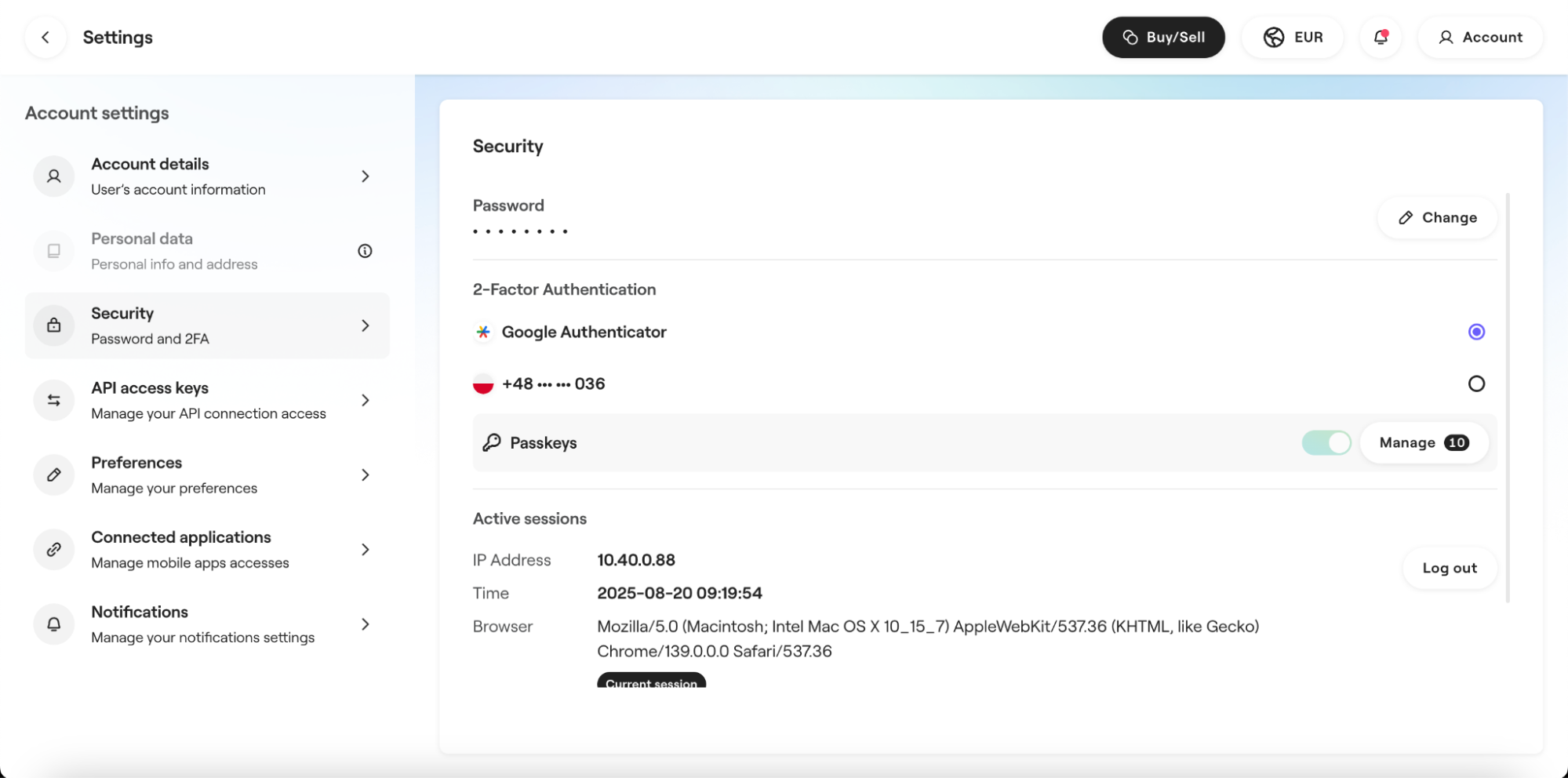 To keep your account secure with passkeys MFA, log in to your zondacrypto account and go to the Account Settings page. Choose the Security tab. In the 2-Factor Authentication section, you can find a new option called "Passkeys".