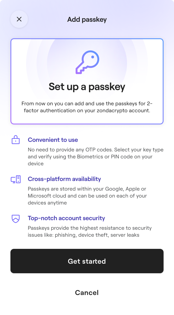 Success! You can begin using your passkey as a main method of multi-factor authentication at zondacrypto exchange.