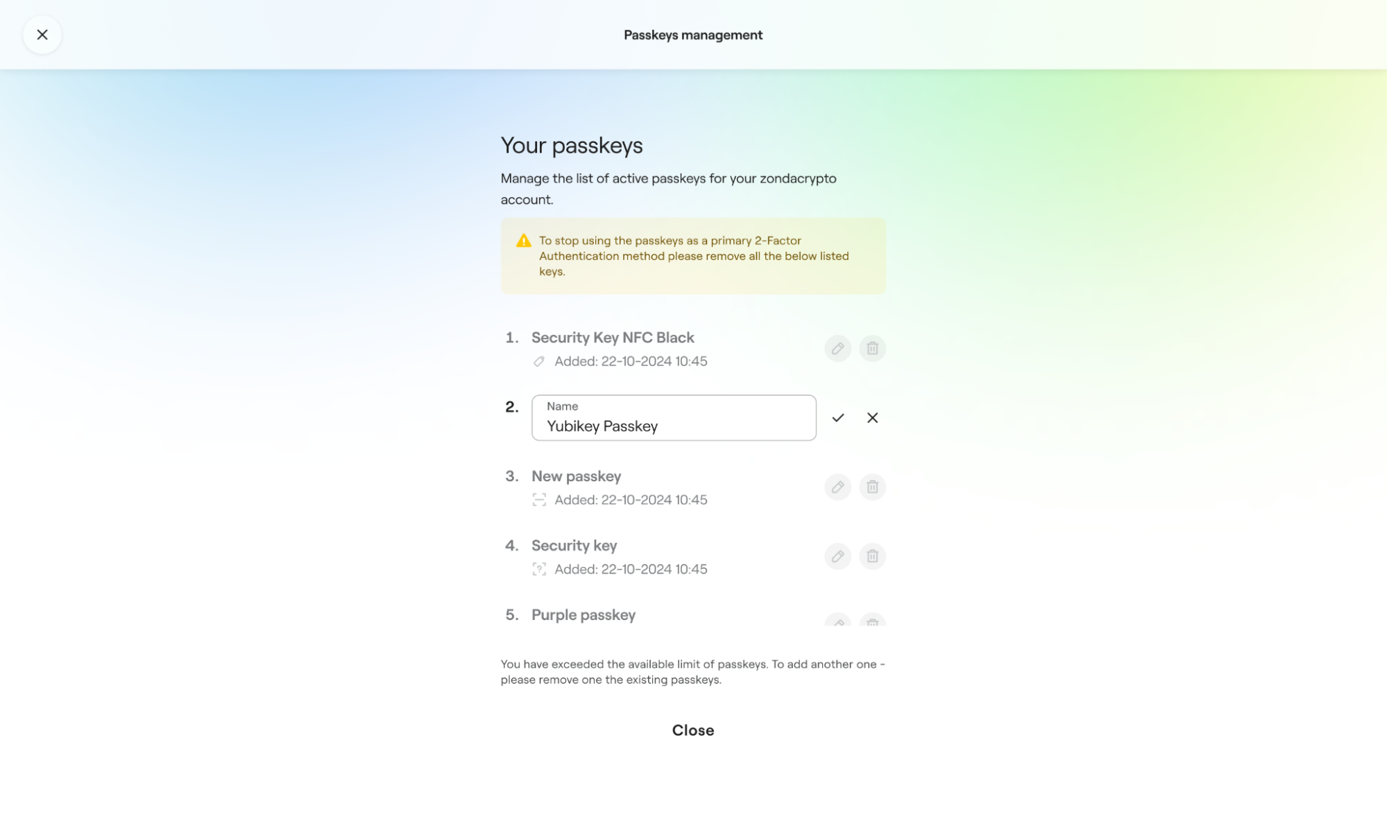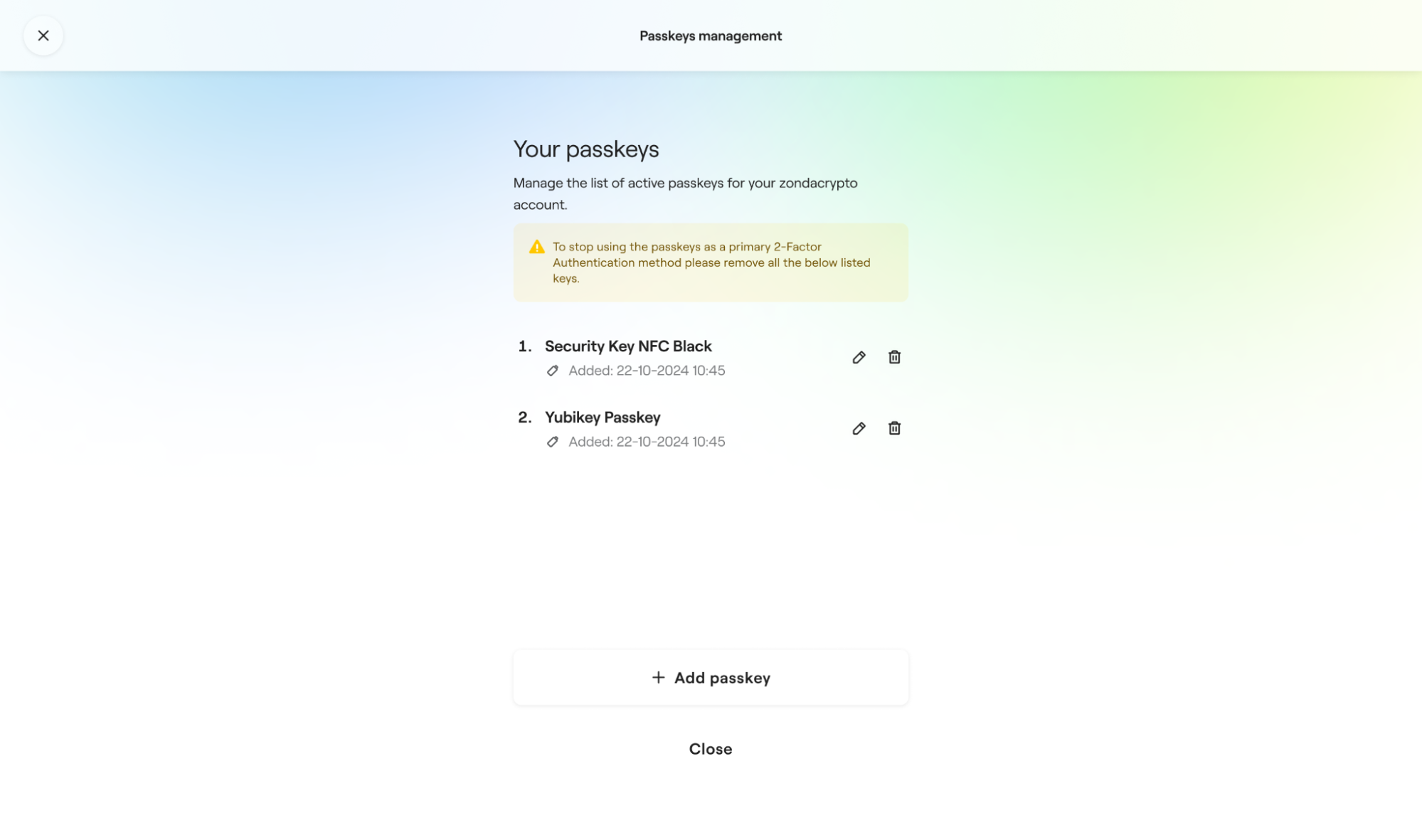 If you don't want to use passkeys for multi-factor authentication anymore, you need to remove all of them from your zondacrypto account via the Passkeys management page: