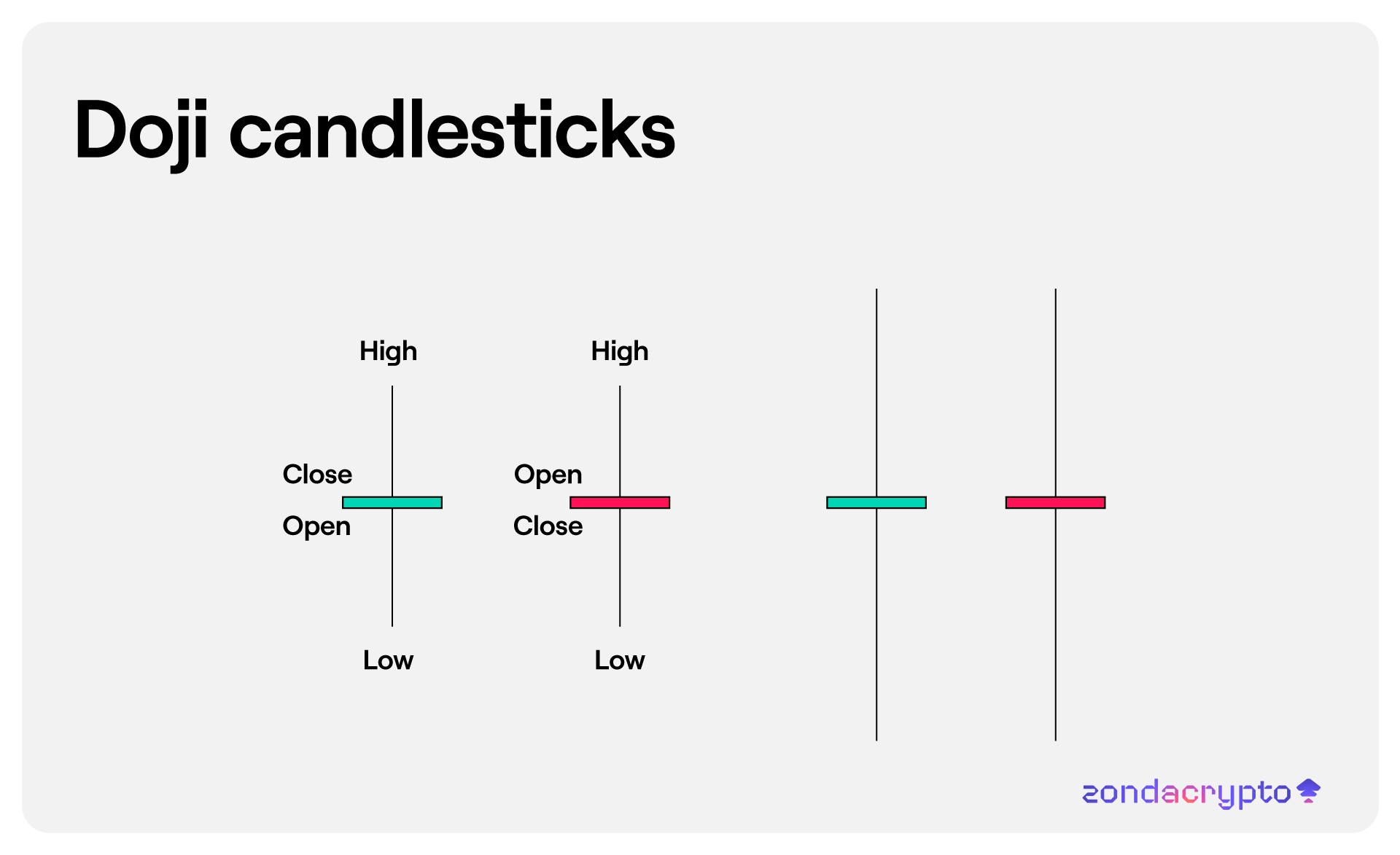 A formation is called a Doji candle when the opening and closing prices are virtually the same. However, as you can see in the picture, these candles can differ from each other. The length of the wick (shadow)in different situations can take on different sizes.