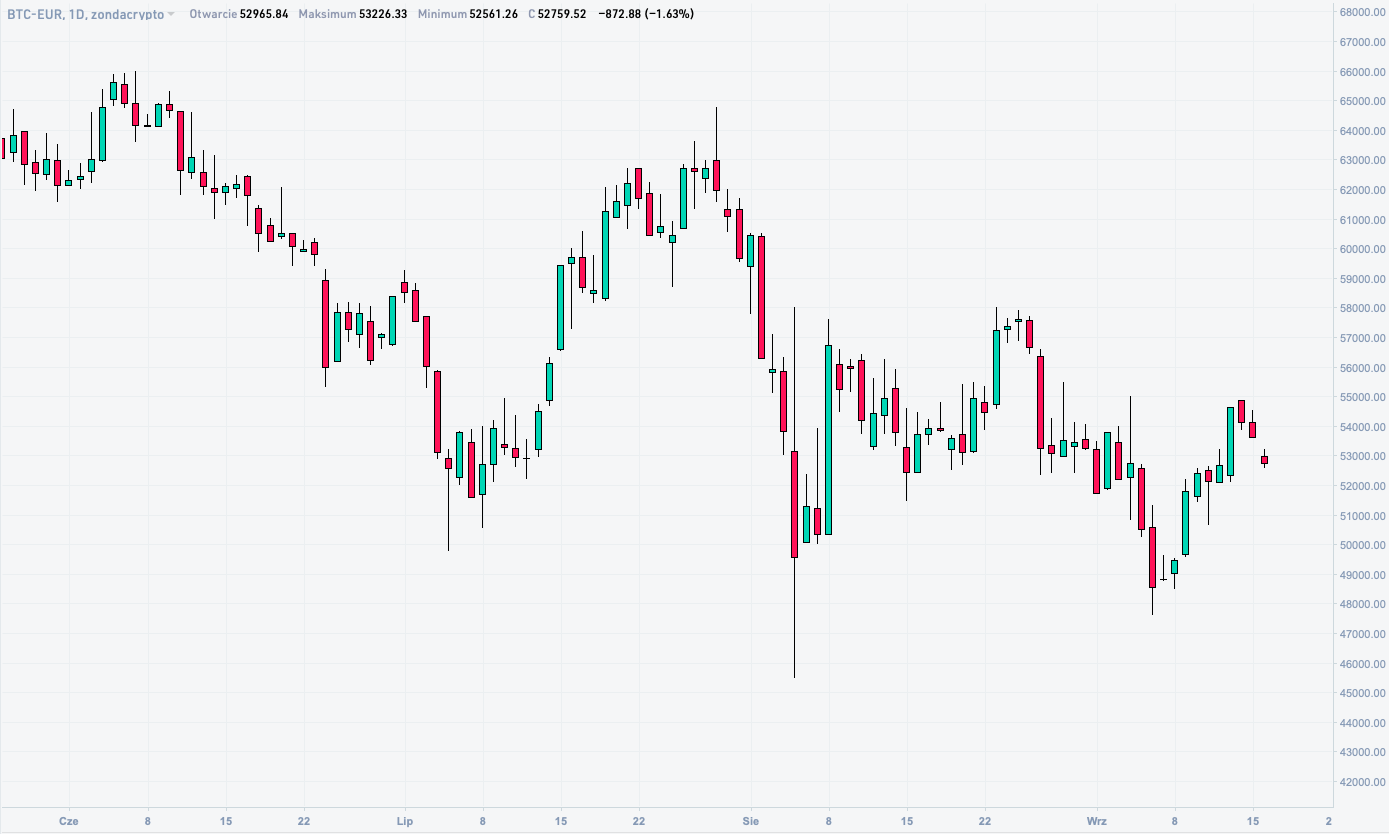 Let's look at a chart of BTC/EUR - one of the most popular cryptocurrency pairs on zondacrypto. The figure shows a chart consisting of candles. Depending on the interval, one candle corresponds to one time interval. For example, on a daily chart, one candle represents one day. If it were a weekly chart - one candle would correspond to one week.