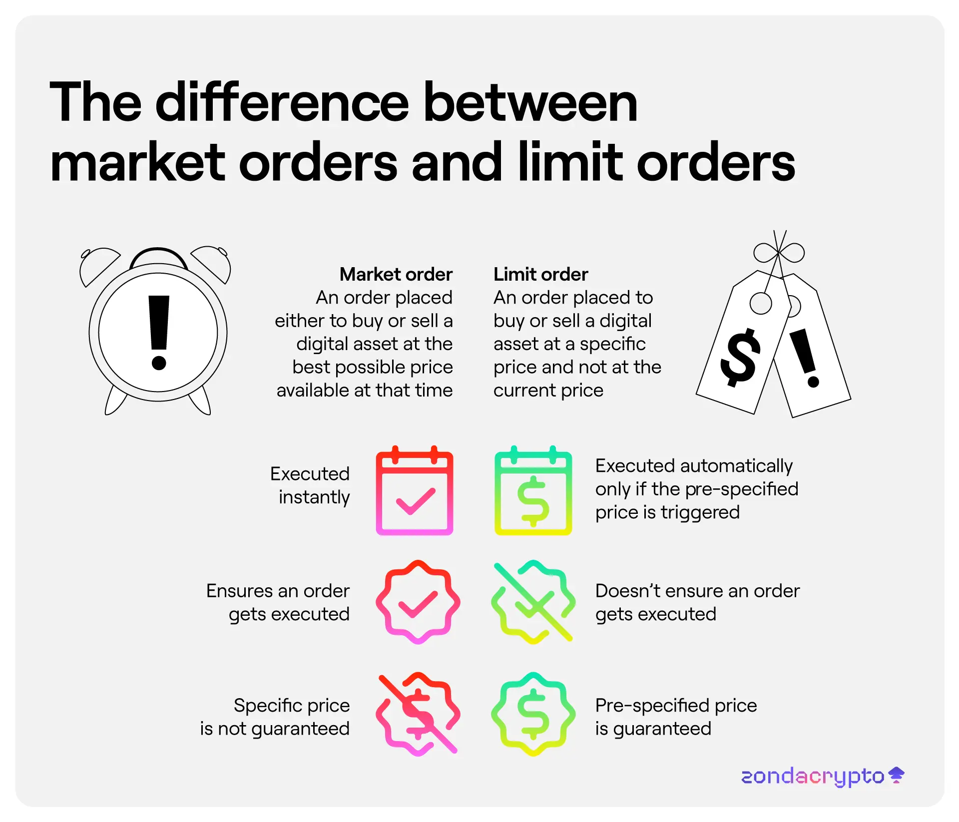 Example of limit order: For instance, if the current market price of Bitcoin is $50,000 you can place a limit order to sell it when the price reaches $60,000. As soon as the price reaches $60,000, your order will be triggered and filled at a price close to $60,000.