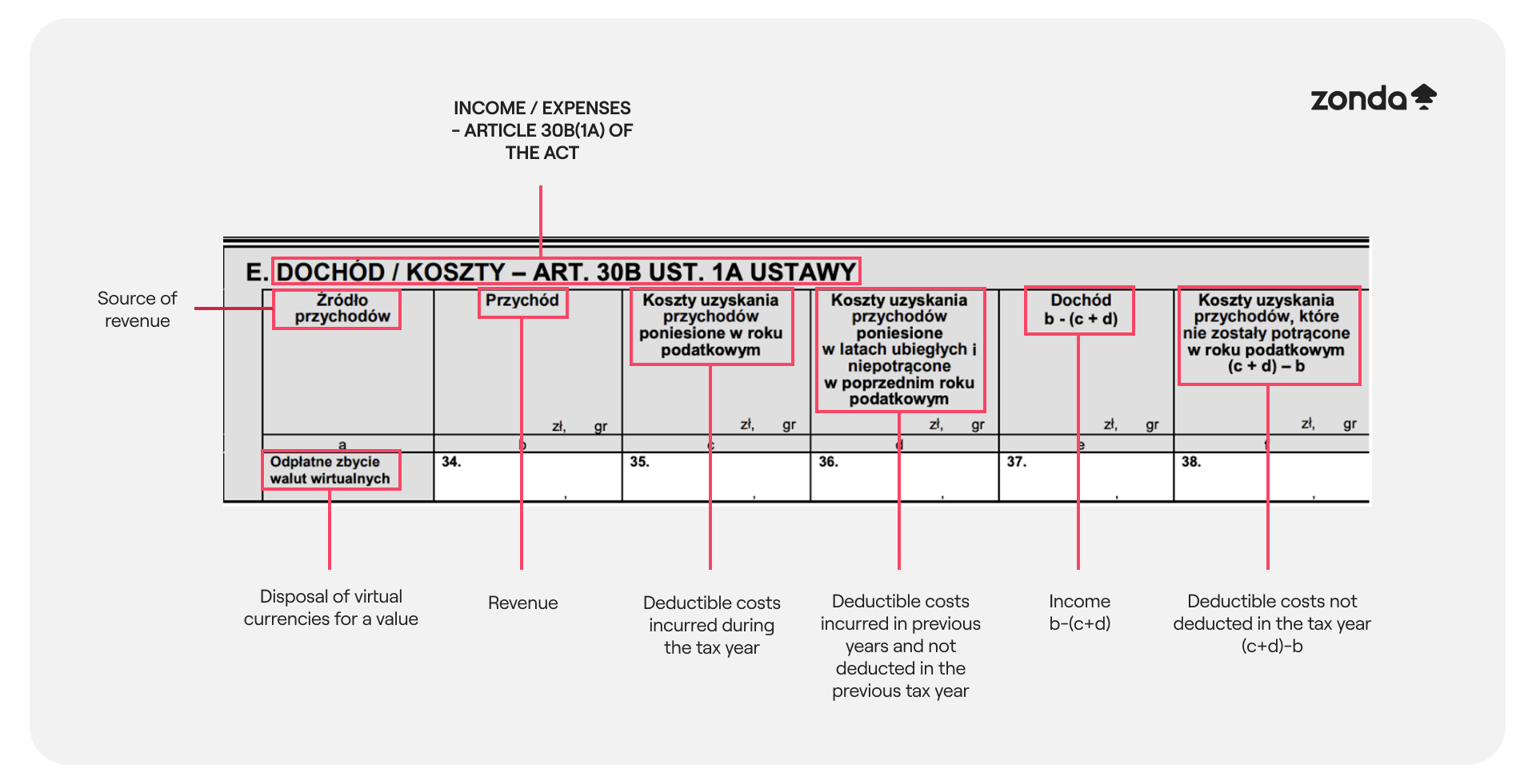 Use form PIT-38 (for income earned in 2022, this will be form 16). Income from this type of activity should not be combined with business income or other sources of income. In practice, this means that income from trading in virtual currencies should be accounted for separately from other sources (in a listed space on the PIT-38 form).