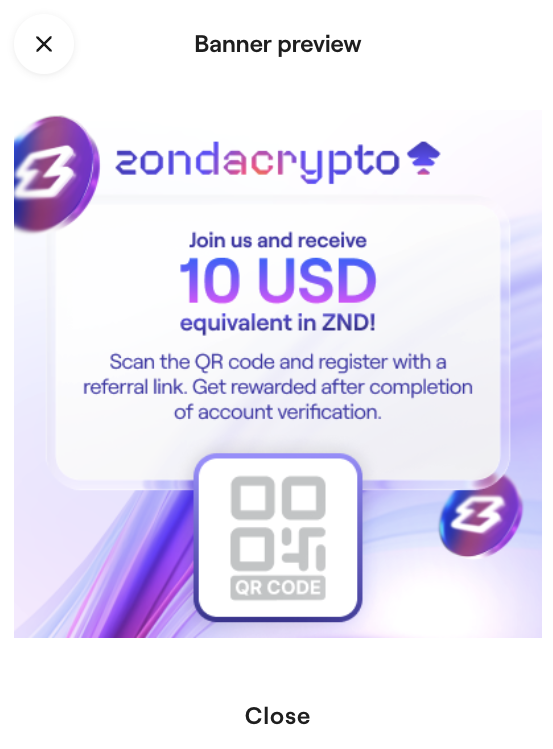 Every banner includes promotional content explaining the rewards and a QR code with your unique link. Users can scan the code with their mobile device for quick access, making it useful for both online and offline promotion.