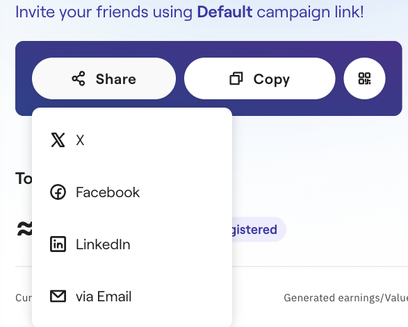 Click the Share button. You will see a menu with options to quickly share the link to your chosen affiliate campaign via: