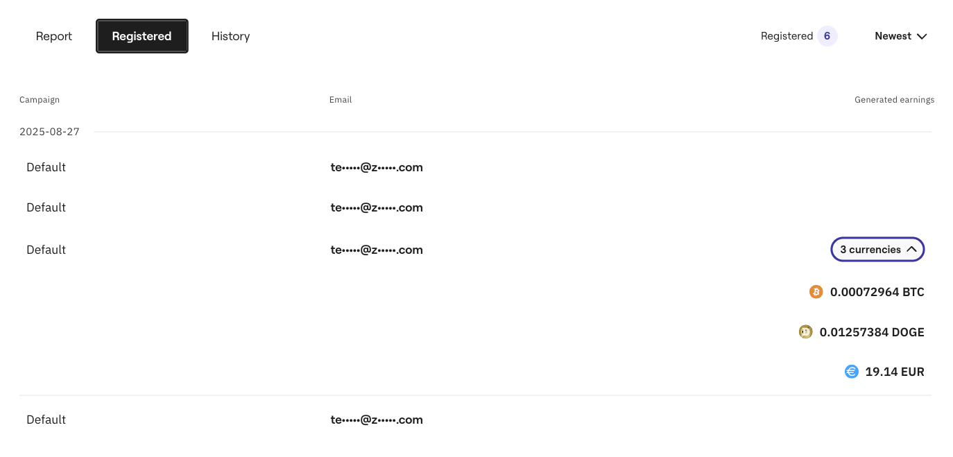 Registered – a complete list of registrations within affiliate campaigns, as well as the amount of earnings generated by each person.