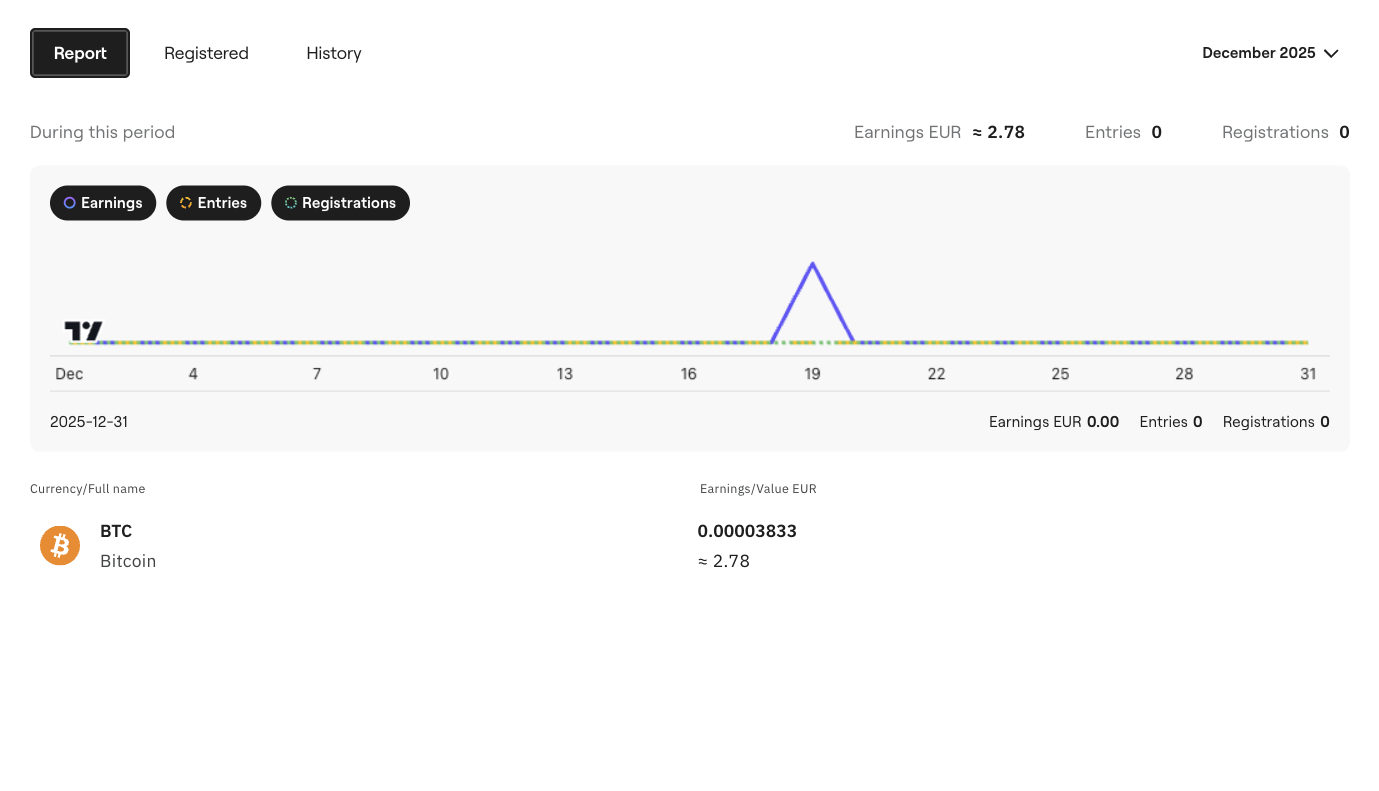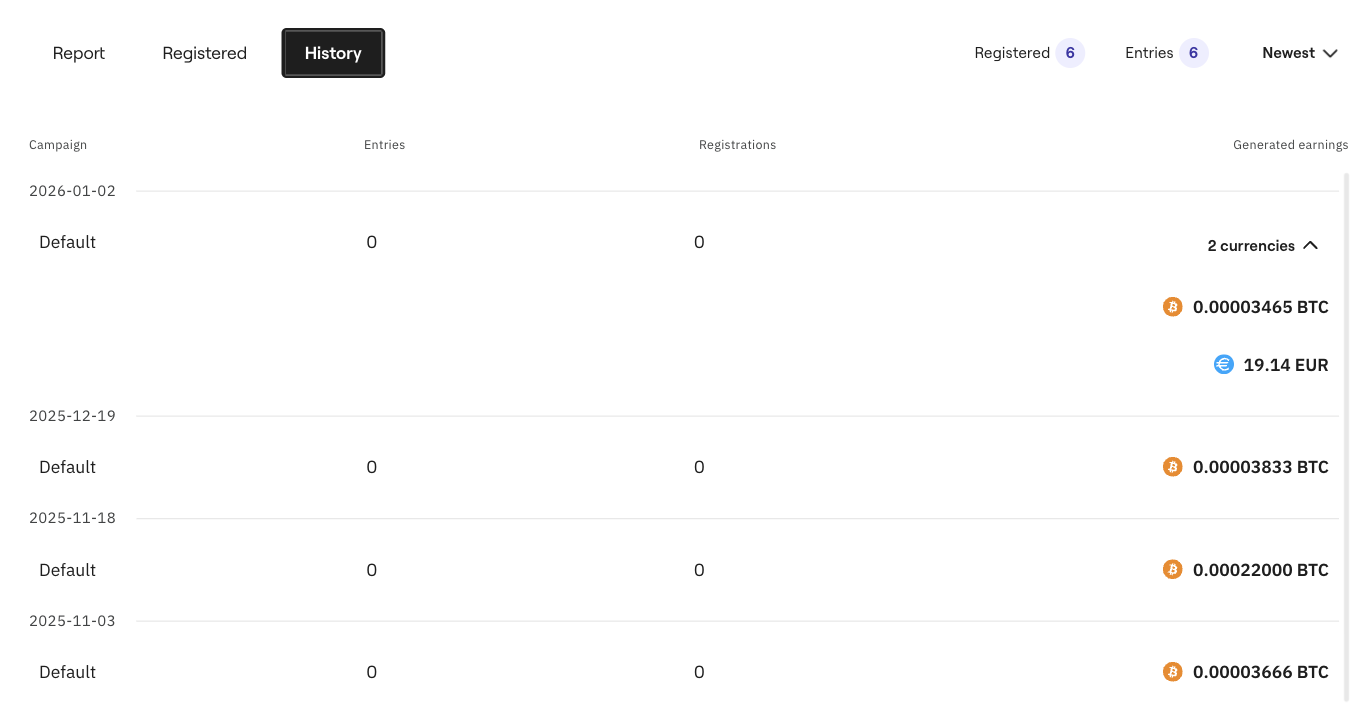 History – a chronological list of events and actions related to the affiliate program, such as visits, registrations, and earnings.