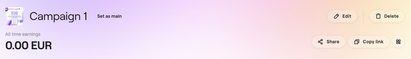 The Active campaigns section is the management center for your affiliate program. Here, you can create, edit, monitor, and share your campaigns.