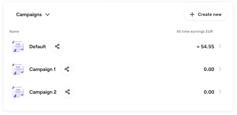 In the Campaigns tab, you will find a complete list of all your active promotional activities. Selecting a specific campaign from the list takes you to the Active campaigns section, where you can access additional options, such as management, performance analysis, link sharing, and creating new activities.