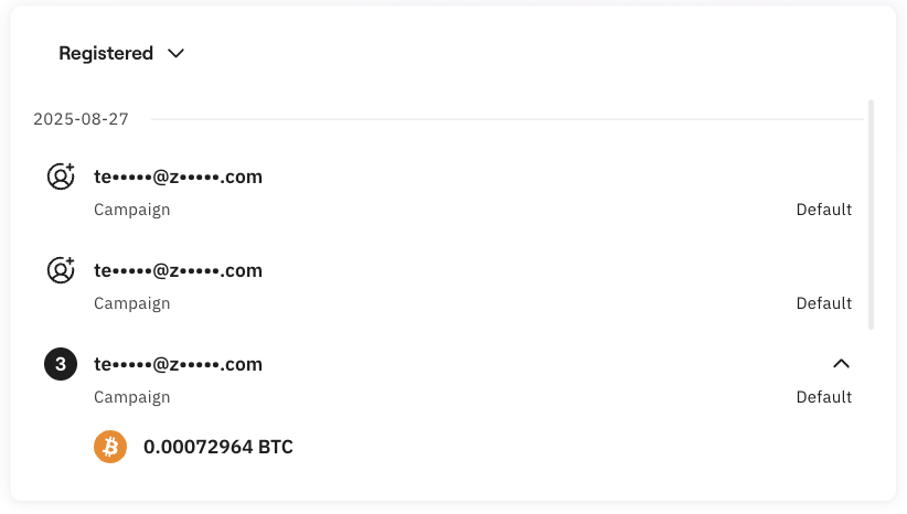 This is the complete list of people who registered via your links, along with the commission they generated.