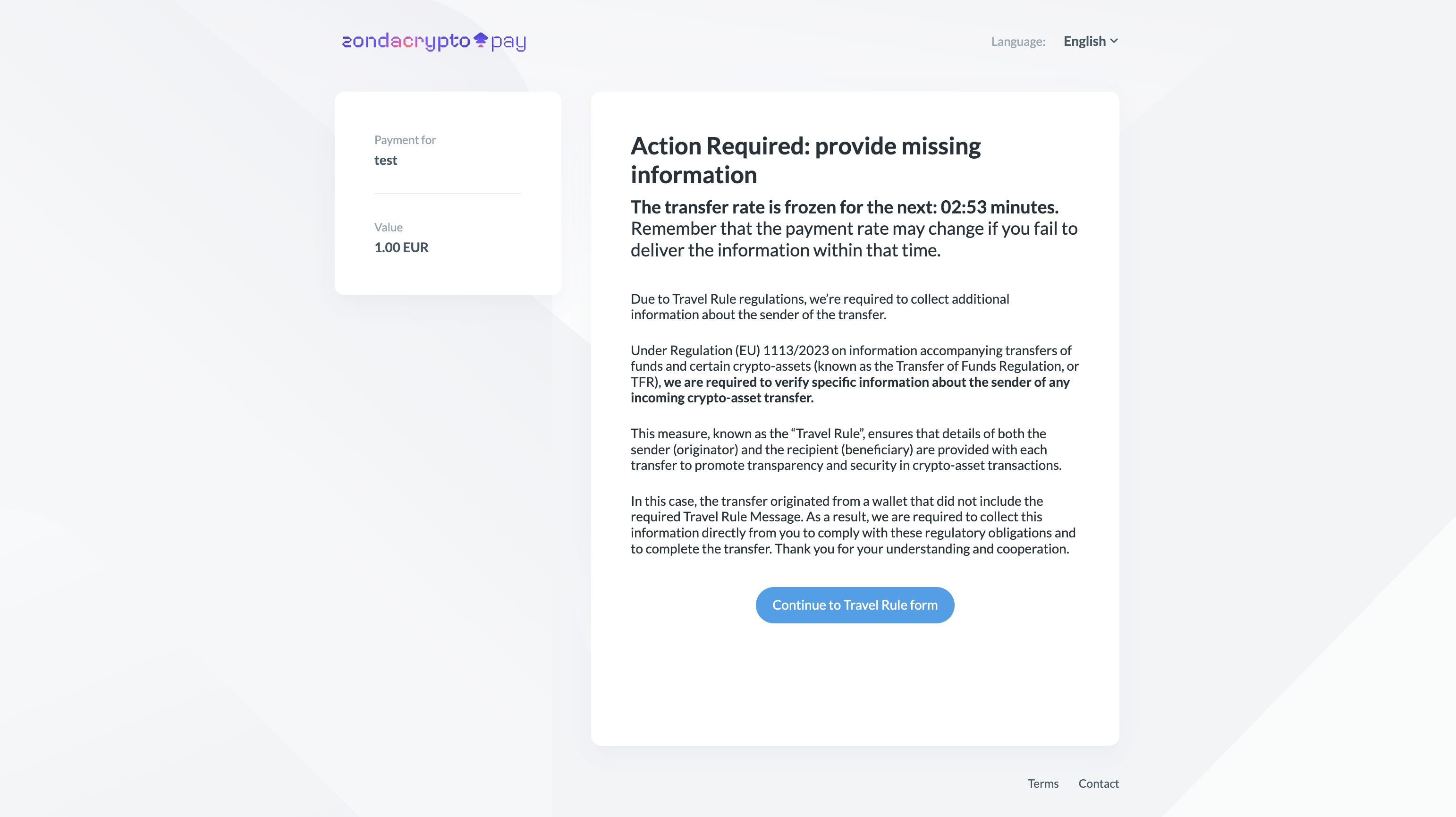 Because of regulations known as the Travel Rule, we need to know who is sending and receiving the cryptocurrency. If your wallet provider does not give us this information, you might be asked to fill it in yourself.