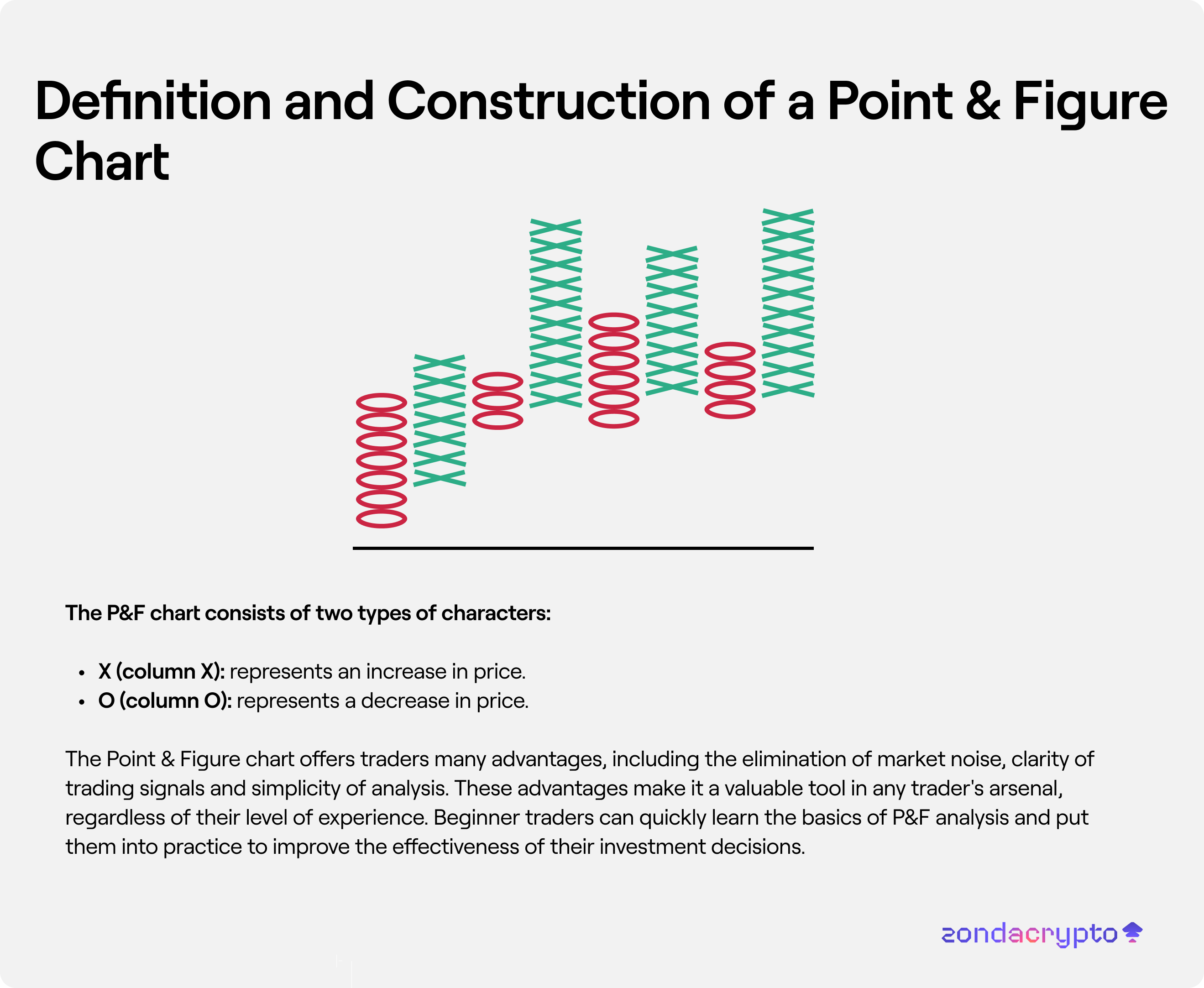 Point & Figure (P&F) charting is an advanced method of technical analysis that differs significantly from traditional candlestick or bar charts. The main feature of a P&F chart is its focus on price movements, ignoring time and trading volume. This allows traders to get an alternative perspective on the market, which often catches significant price movements while ignoring smaller fluctuations.