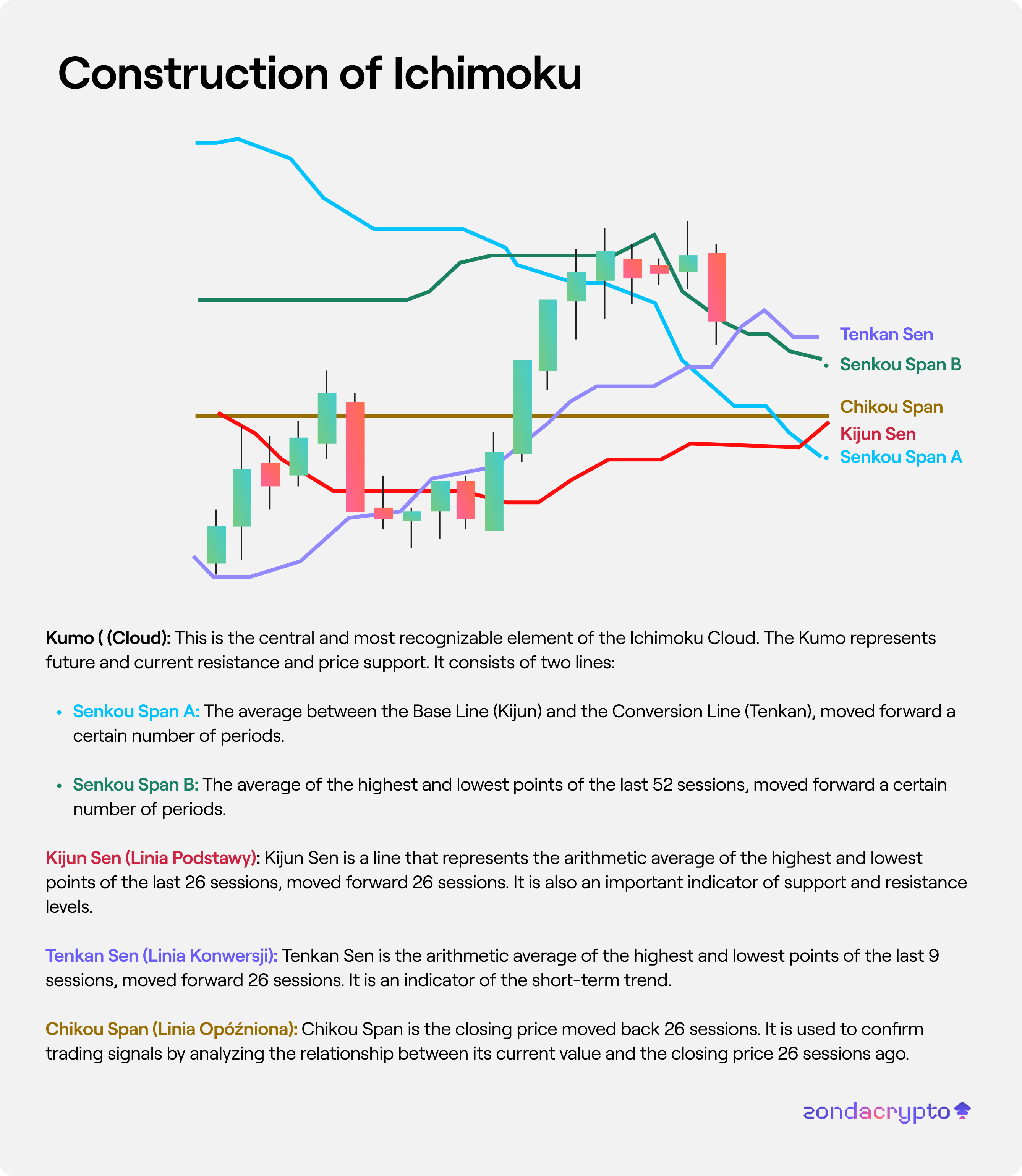 Ichimoku Kinko Hyo, known as Ichimoku Cloud, not only identifies the trend and generates trading signals, but is also an effective tool for analyzing support and resistance levels in the cryptocurrency market. lets take a closer look at some of its elements: