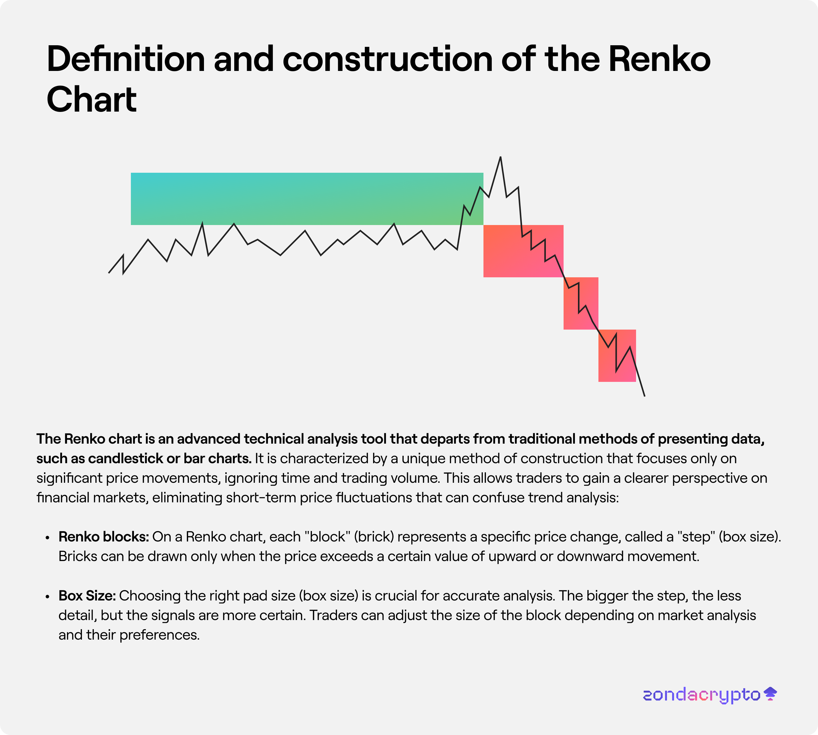 Renko blocks: On a Renko chart, each "block" (brick) represents a specific price change, called a "step" (box size). Bricks can be drawn only when the price exceeds a certain value of upward or downward movement.