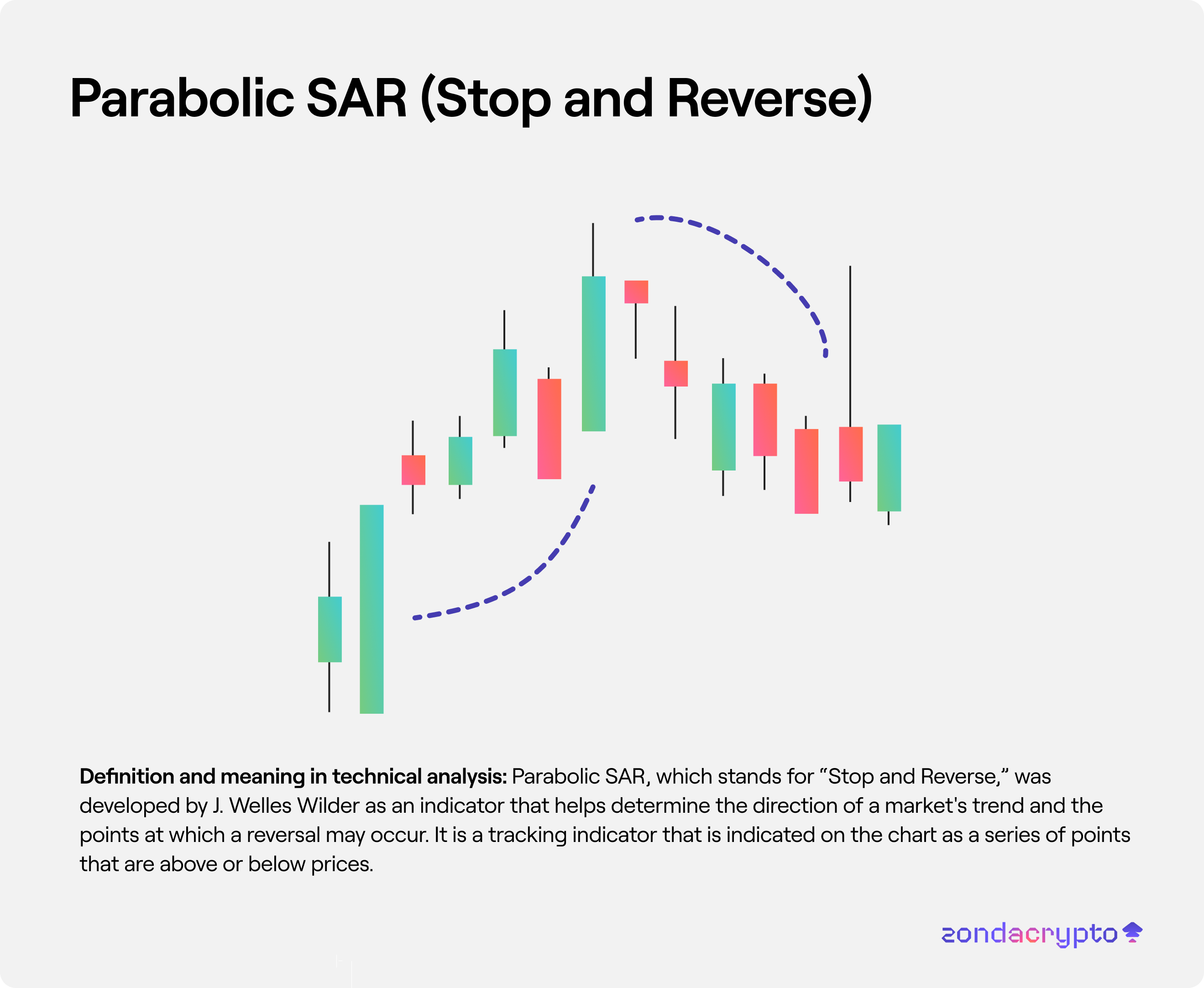 Parabolic SAR, which stands for “Stop and Reverse,” was developed by J. Welles Wilder as an indicator that helps determine the direction of a market's trend and the points at which a reversal may occur. It is a tracking indicator that is indicated on the chart as a series of points that are above or below prices.