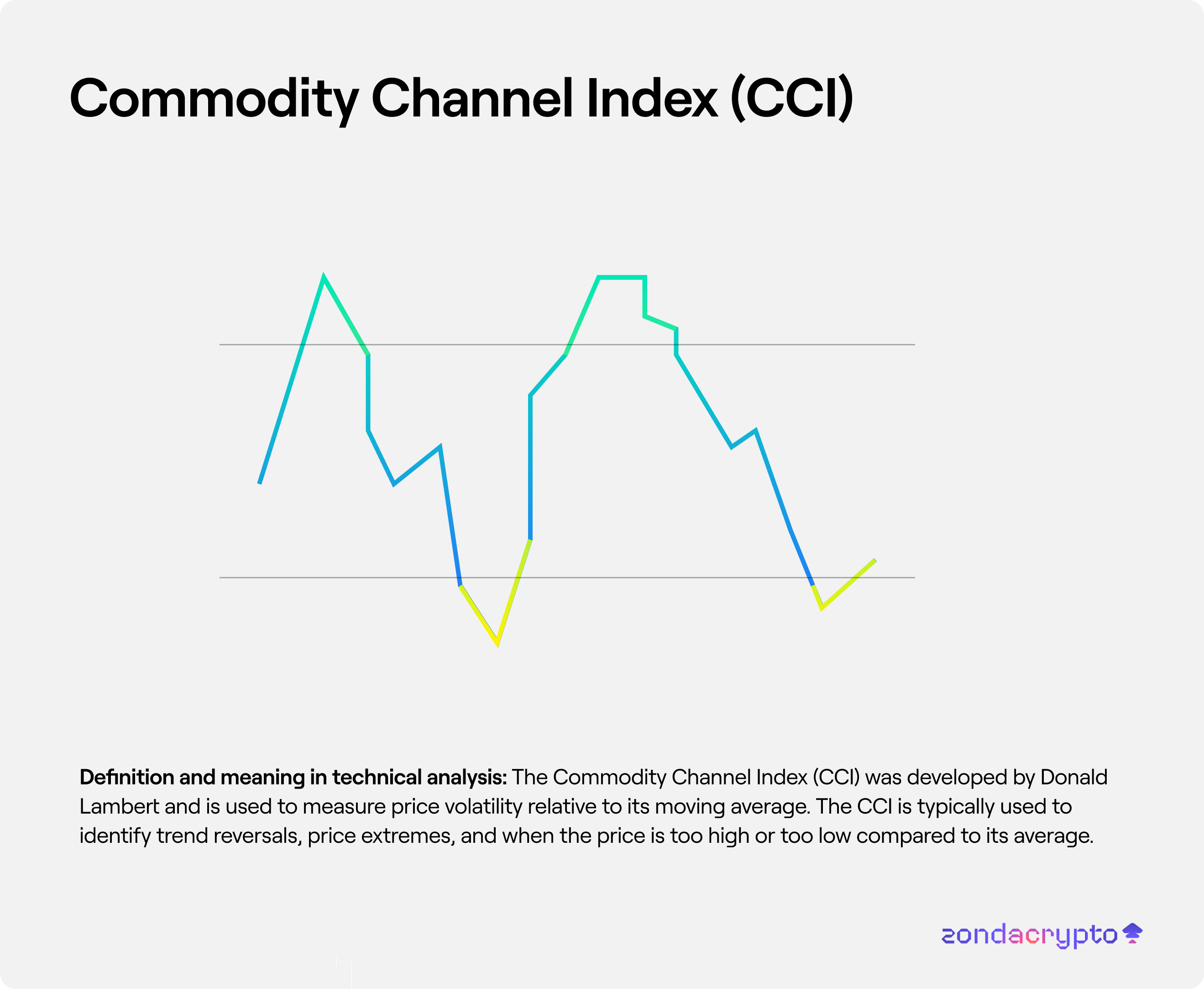 The Commodity Channel Index (CCI) was developed by Donald Lambert and is used to measure price volatility relative to their moving average. The CCI is typically used to identify trend reversals, price extremes and to identify moments when a price is too high or too low compared to its average.