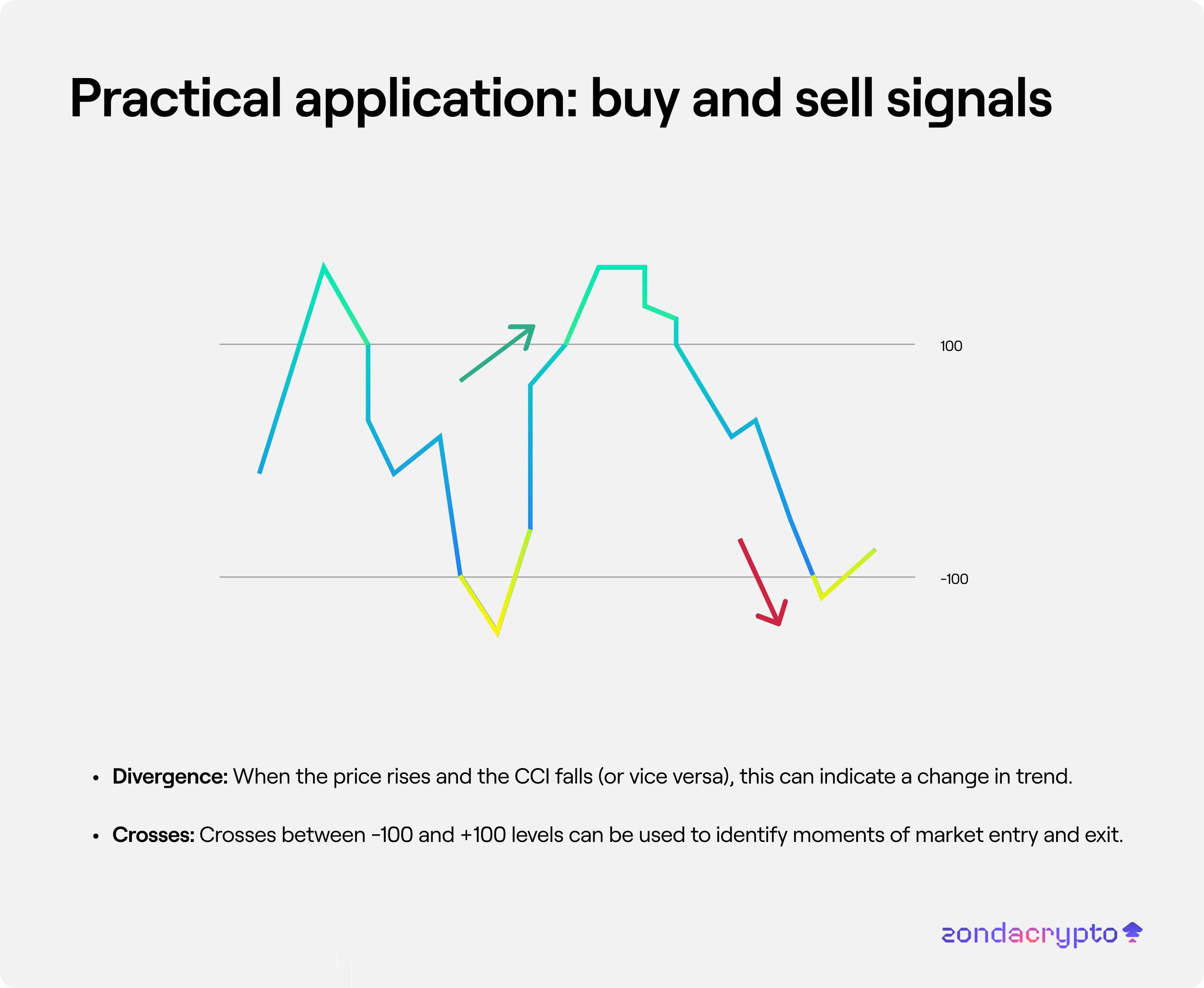 Crosses: Crosses between -100 and +100 levels can be used to identify moments of market entry and exit.