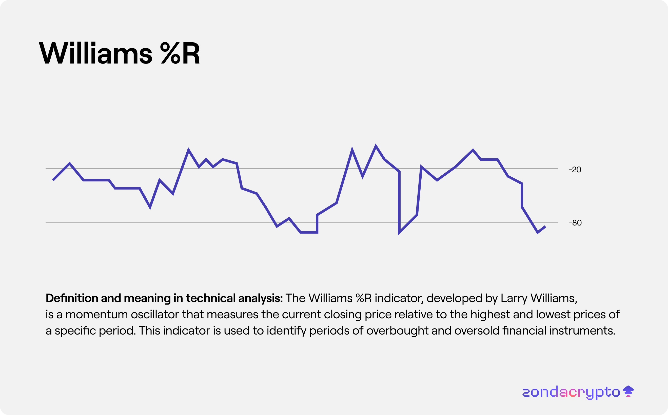 The Williams %R indicator, developed by Larry Williams, is a momentum oscillator that measures the current closing price relative to the highest and lowest prices of a specific period. This indicator is used to identify periods of overbought and oversold financial instruments.