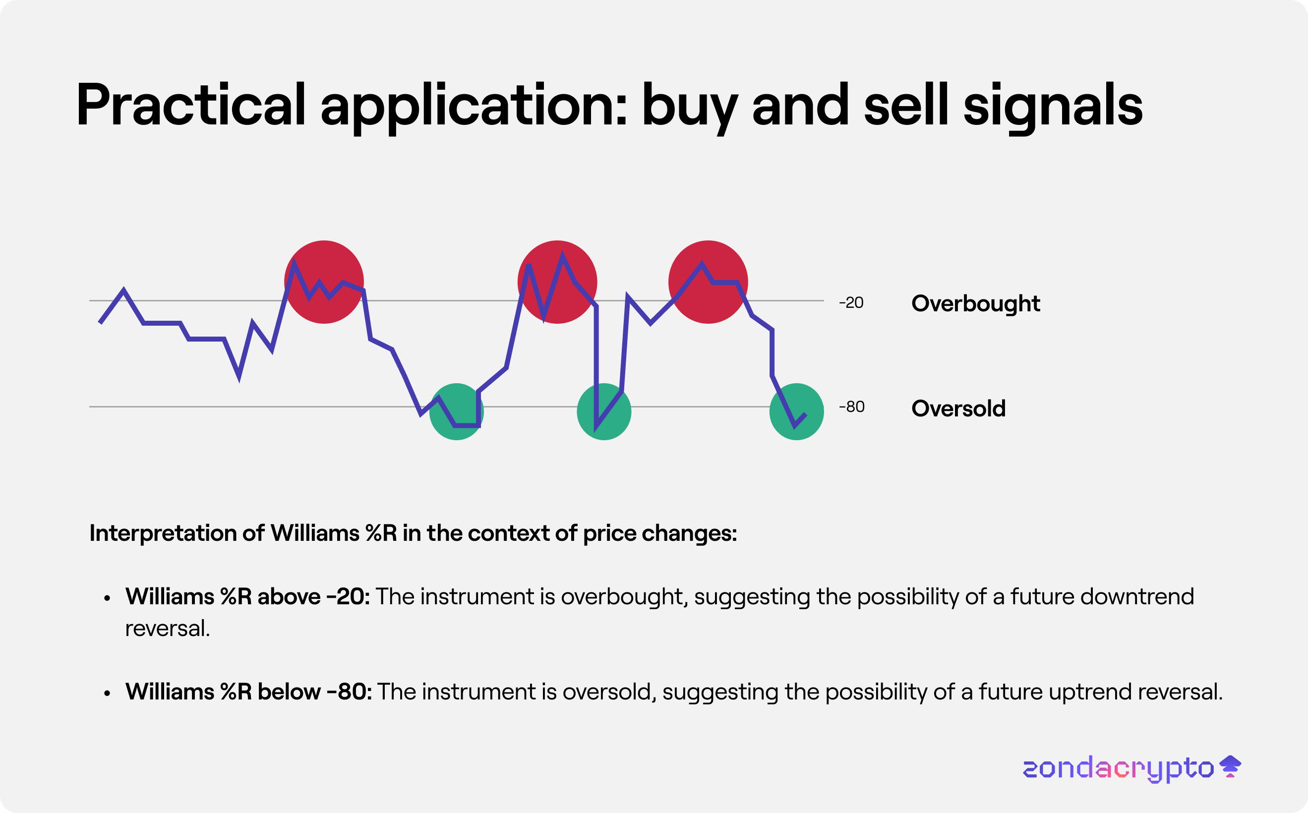 The Williams %R indicator provides some practical trading signals: