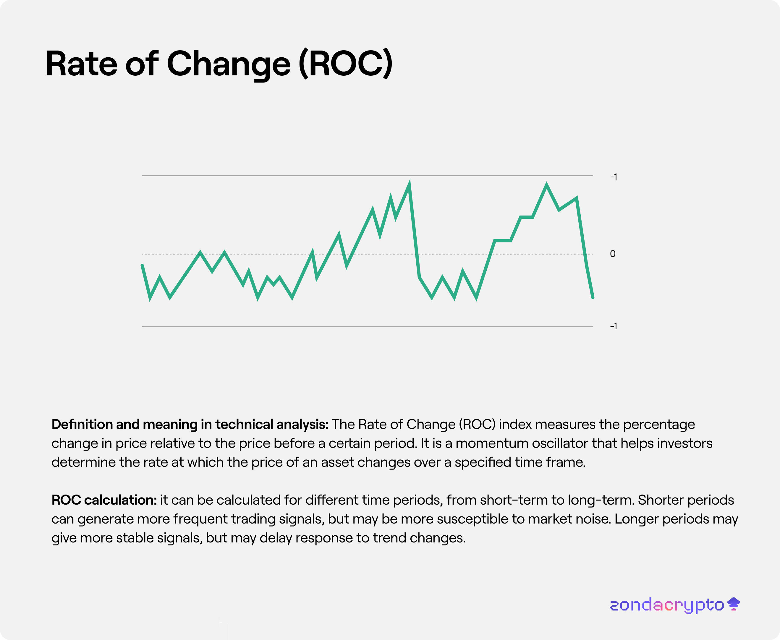Changes in the rate of increase and decrease: An ROC above zero indicates an increasing rate of price increases, while an ROC below zero indicates an increasing rate of price decreases.