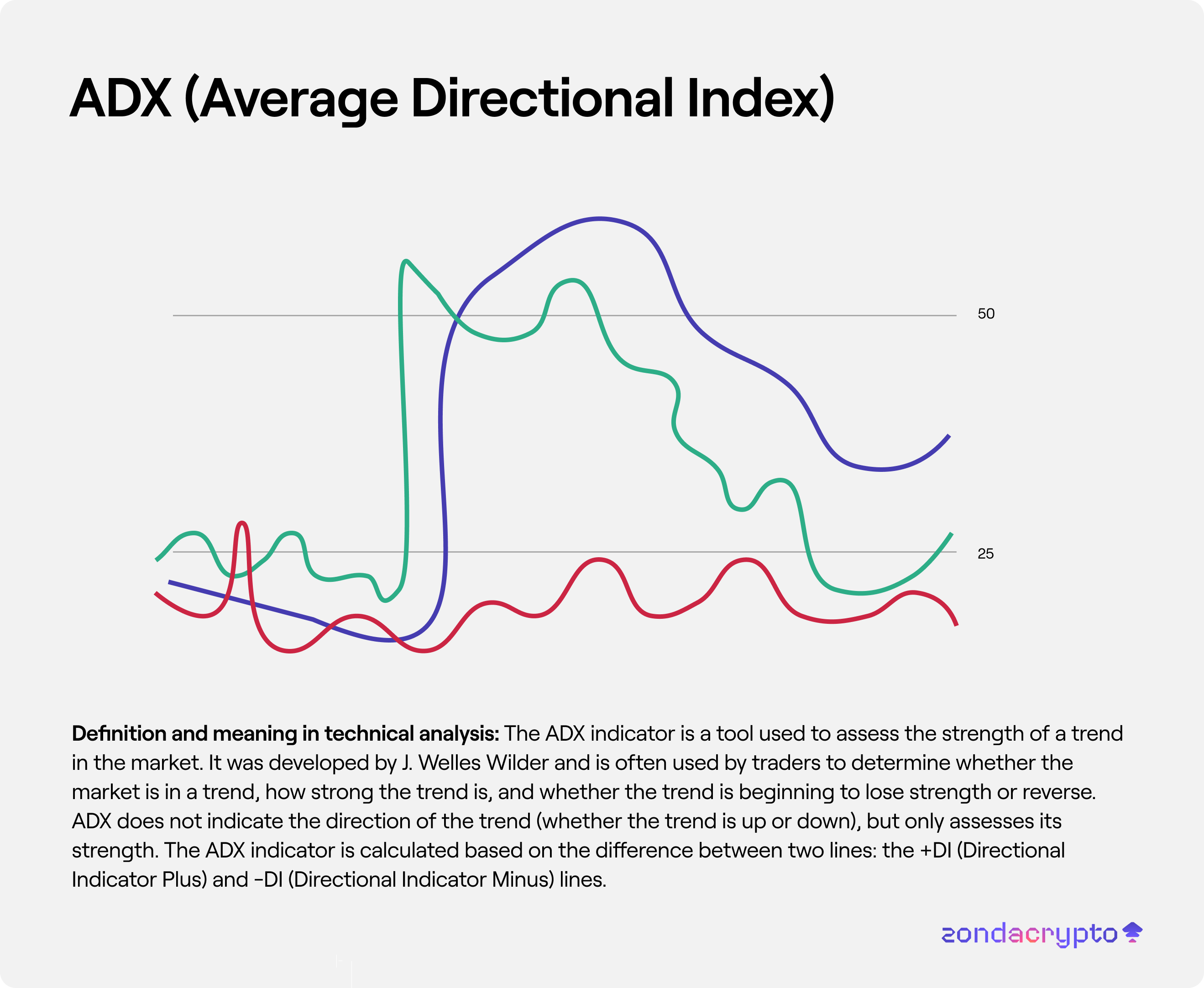 The ADX indicator is a tool used to assess the strength of a trend in the market. It was developed by J. Welles Wilder and is often used by traders to determine whether the market is in a trend, how strong the trend is, and whether the trend is beginning to lose strength or reverse.