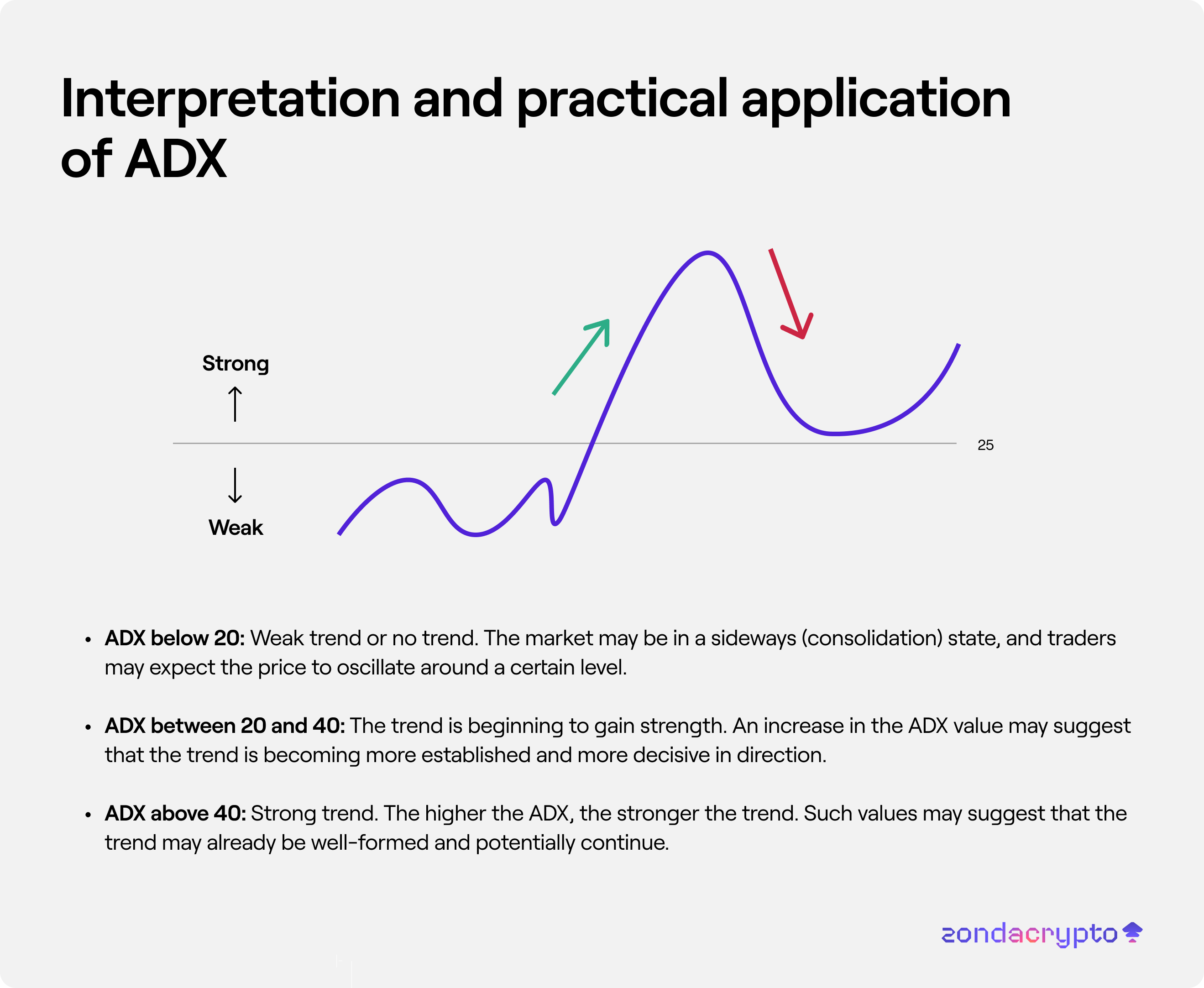 ADX below 20: Weak trend or no trend. The market may be in a sideways (consolidation) state, and traders may expect the price to oscillate around a certain level.