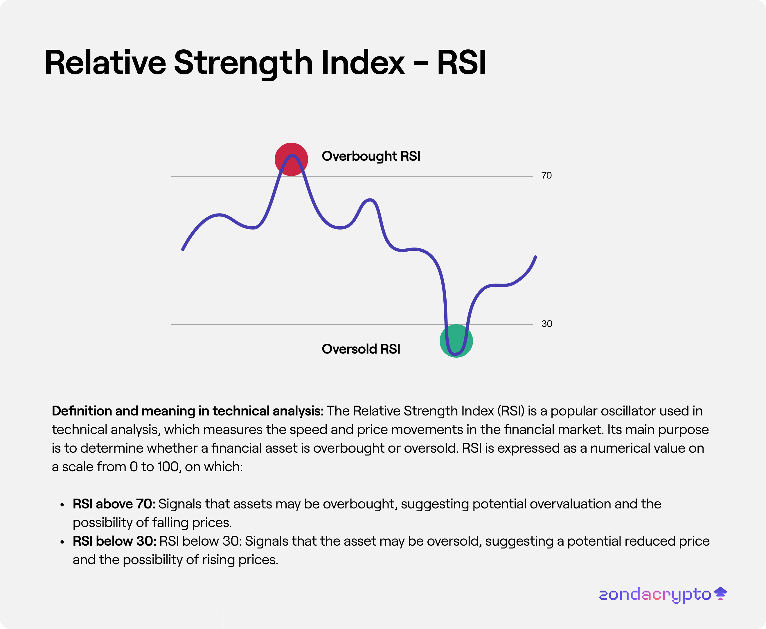 The Relative Strength Index (RSI) is a popular oscillator used in technical analysis, which measures the speed and price movements in the financial market. Its main purpose is to determine whether a financial asset is overbought or oversold. RSI is expressed as a numerical value on a scale from 0 to 100, on which: