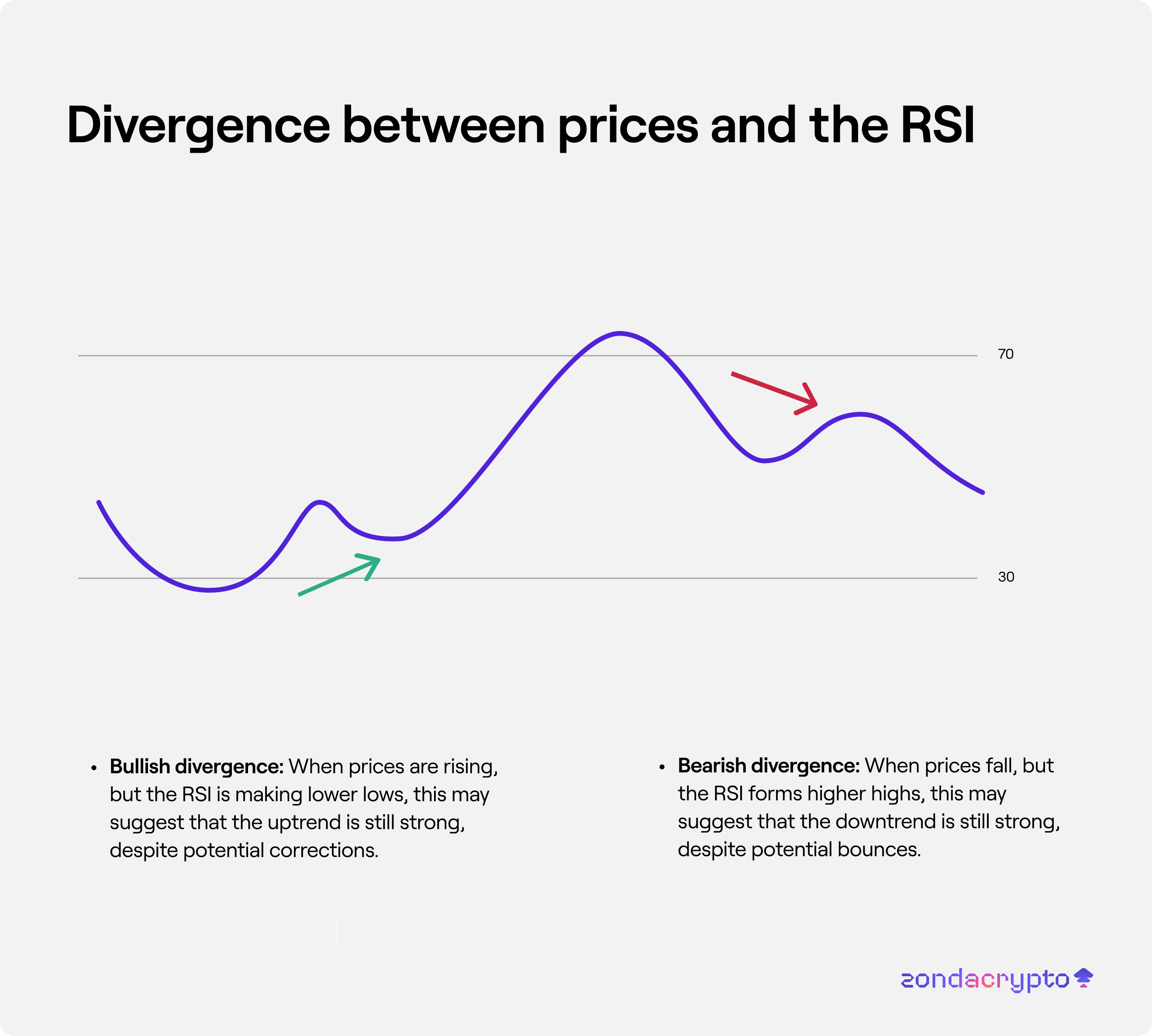 Bullish divergence: When prices are rising, but the RSI is making lower lows, this may suggest that the uptrend is still strong, despite potential corrections.