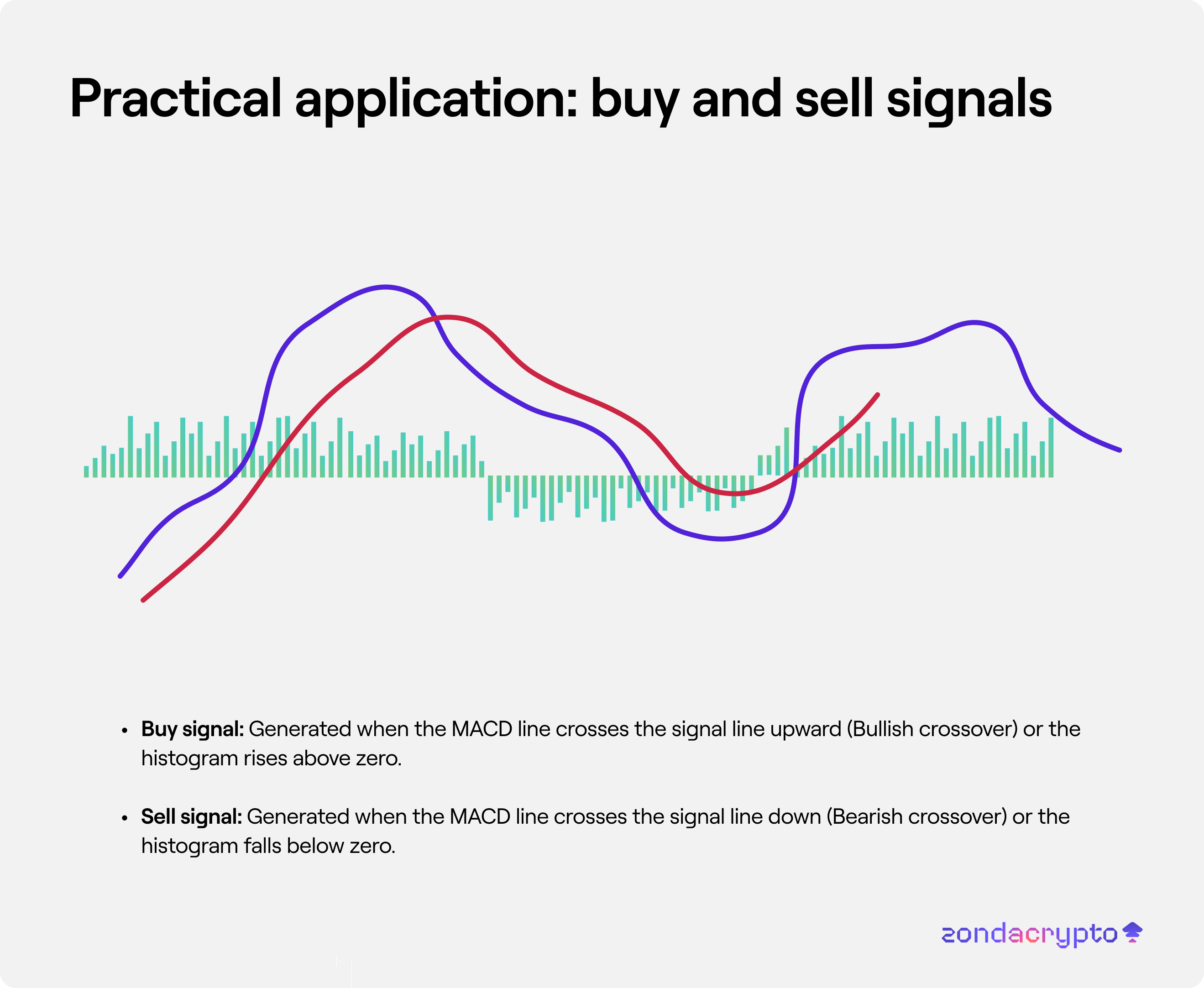 Sell signal: Generated when the MACD line crosses the signal line down (Bearish crossover) or the histogram falls below zero.