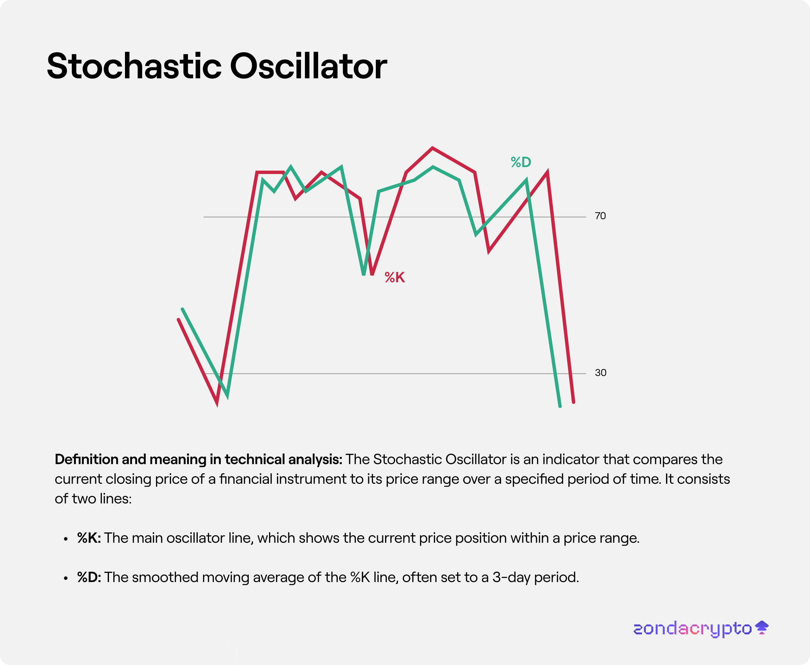 %D: The smoothed moving average of the %K line, often set to a 3-day period.