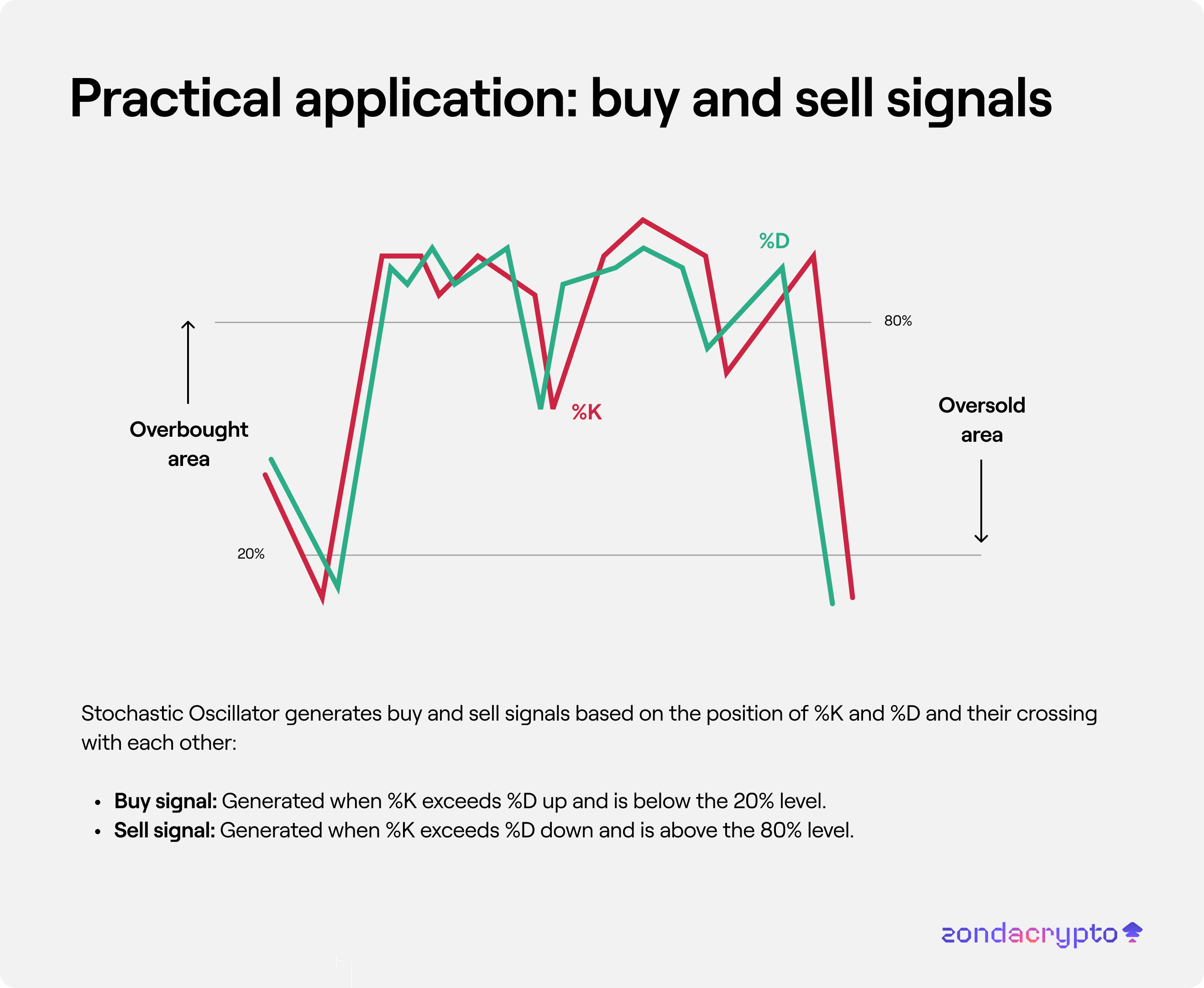 Stochastic Oscillator generates buy and sell signals based on the position of %K and %D and their crossing with each other: