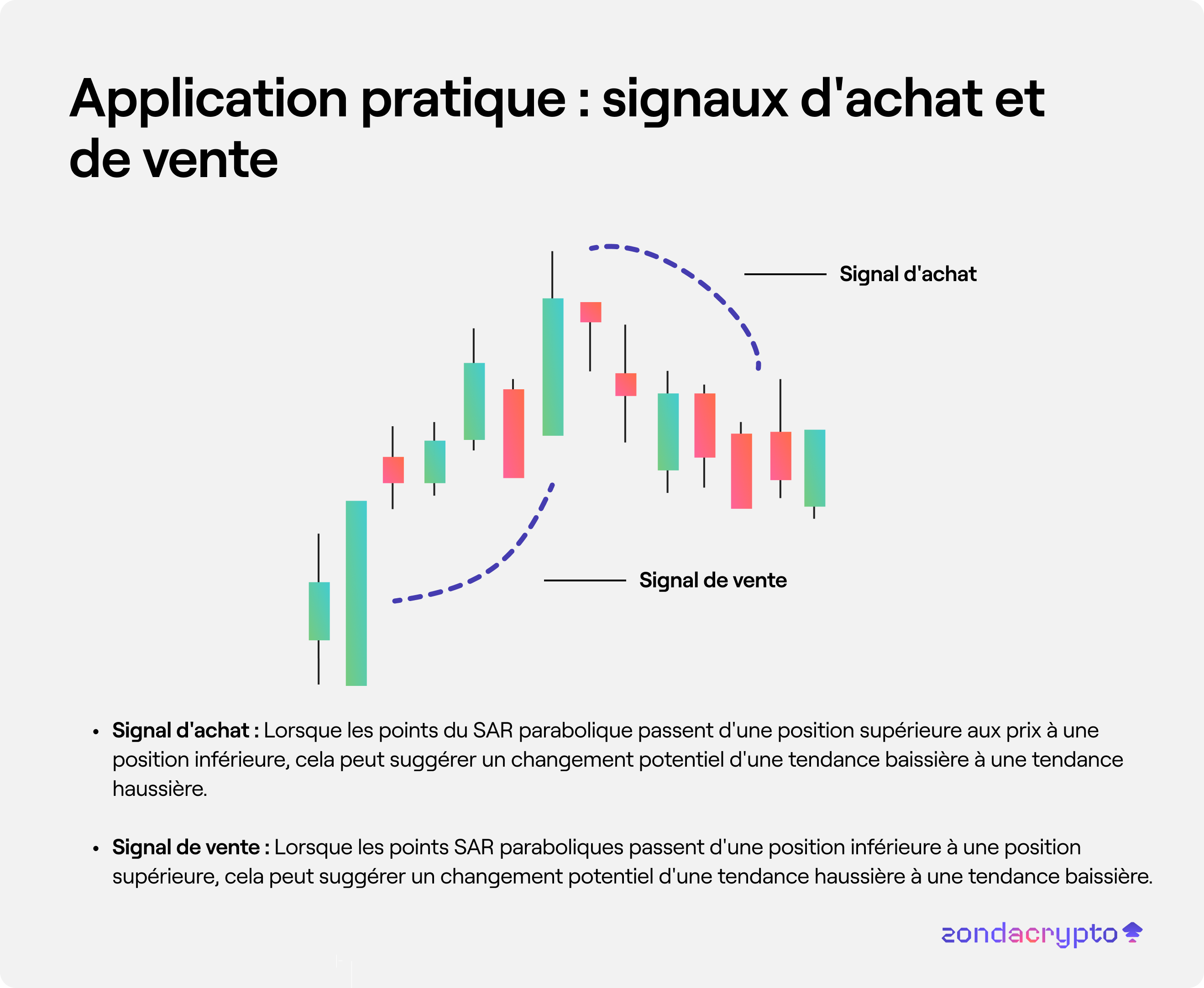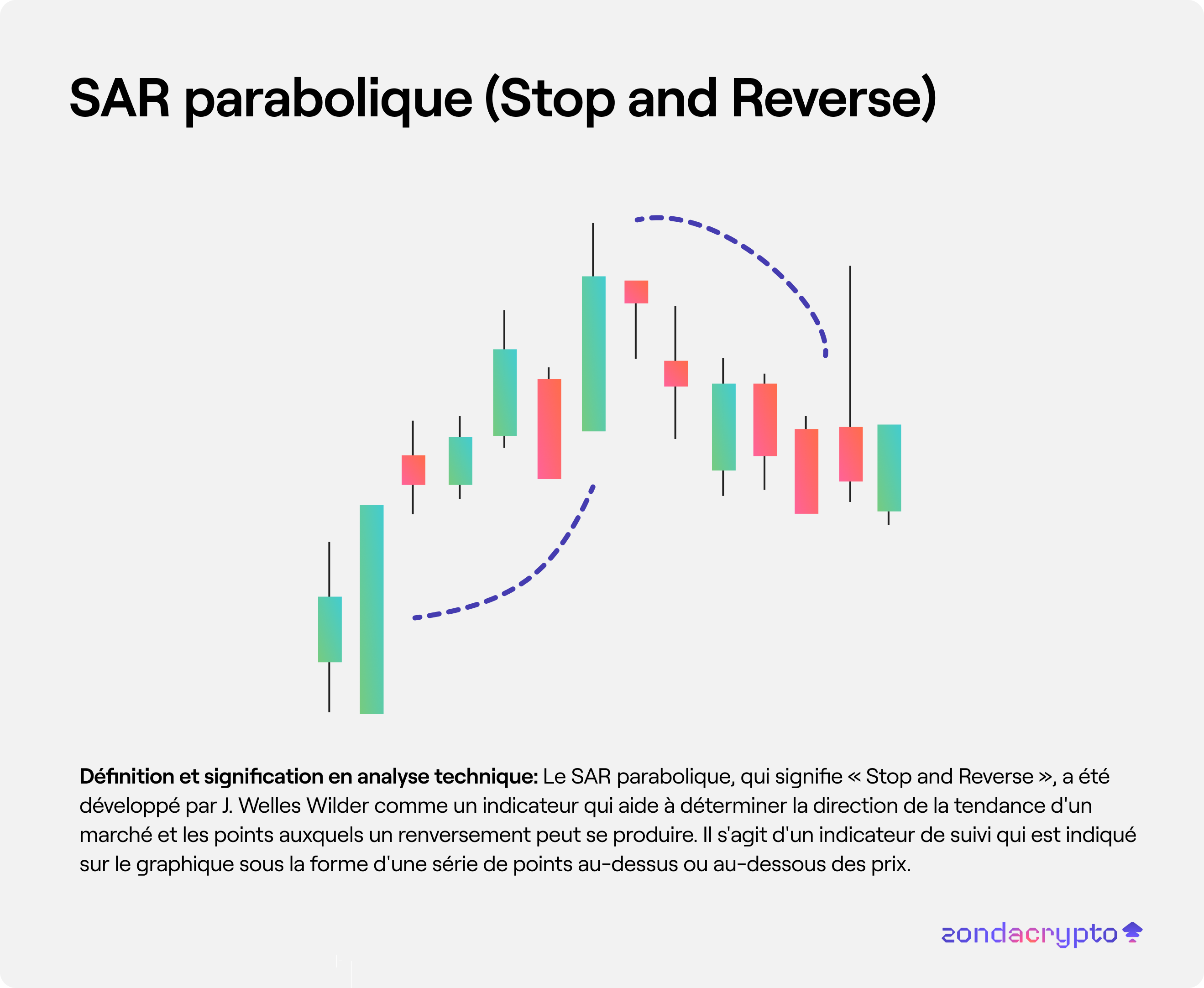 Le SAR parabolique (Stop and Reverse) est un indicateur technique qui aide les traders à identifier les tendances et les points de retournement sur les marchés financiers, y compris les crypto-monnaies. En suivant la position des points SAR paraboliques par rapport aux prix, les traders peuvent prendre des décisions de trading plus éclairées, gérer le risque et déterminer les niveaux de stop-loss et de profit.
