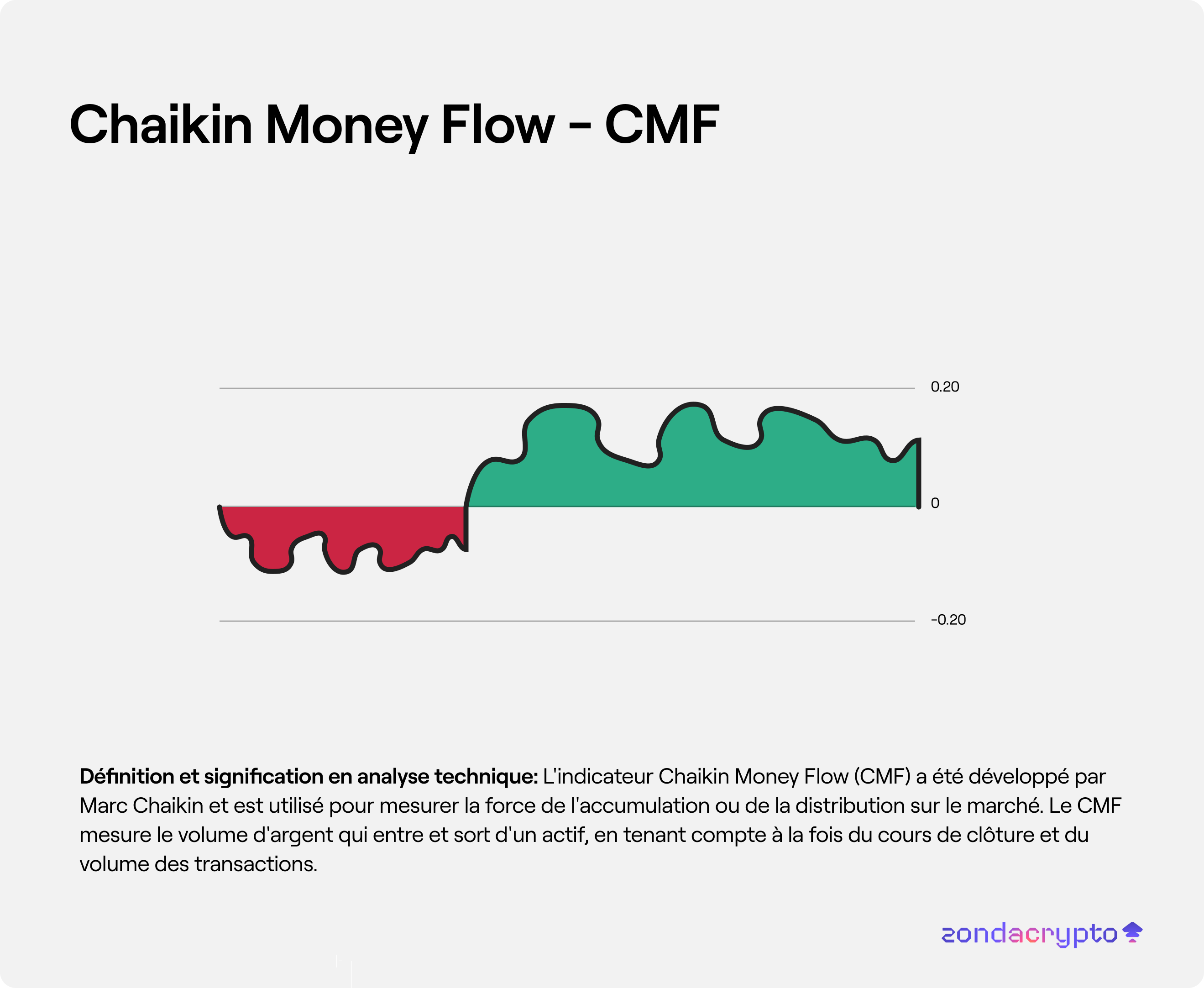 L'indicateur Chaikin Money Flow (CMF) a été développé par Marc Chaikin et est utilisé pour mesurer la force de l'accumulation ou de la distribution sur le marché. Le CMF mesure le volume d'argent qui entre et sort d'un actif, en tenant compte à la fois du cours de clôture et du volume des transactions.