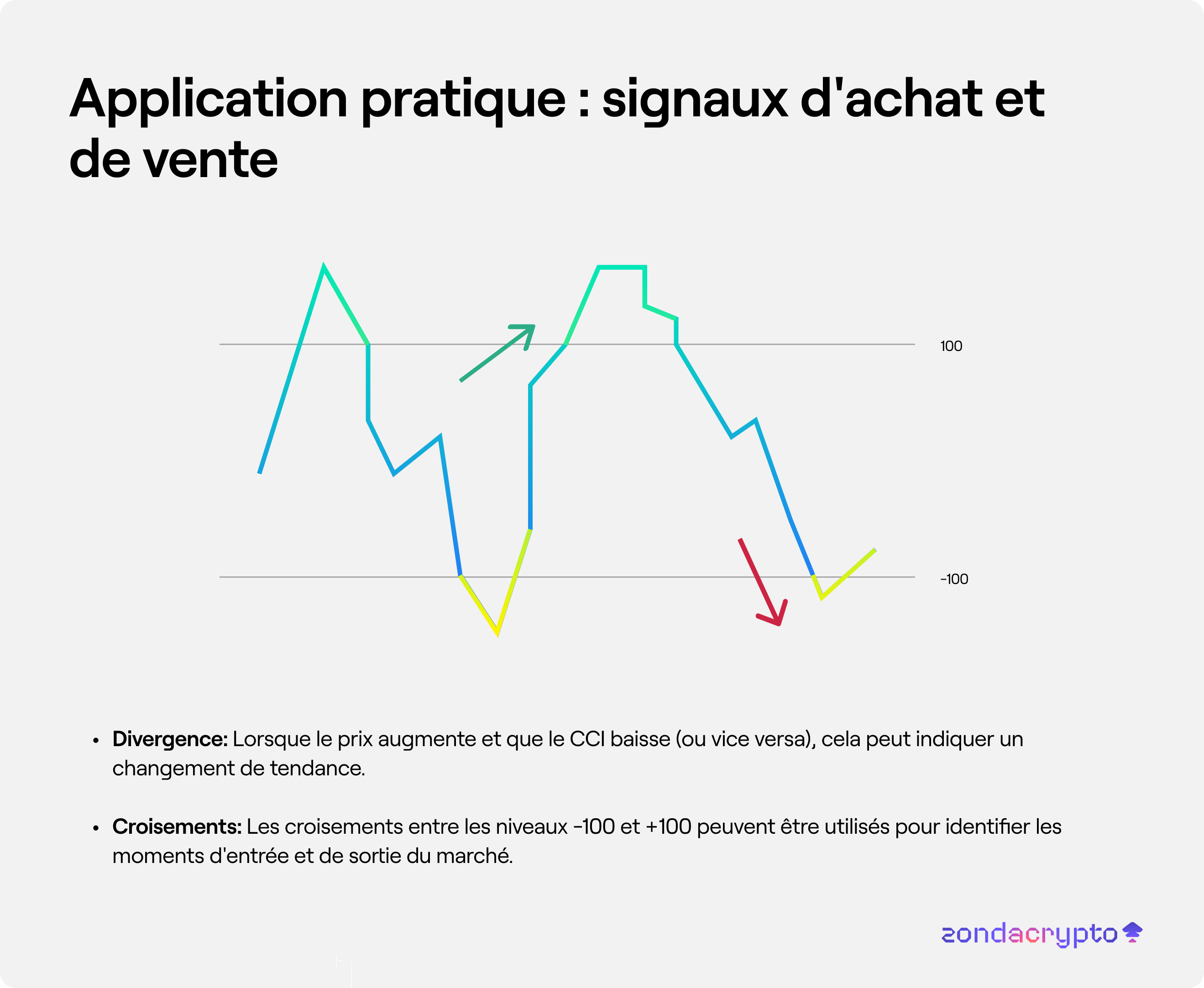 • Divergence: Lorsque le prix augmente et que le CCI baisse (ou vice versa), cela peut indiquer un changement de tendance.