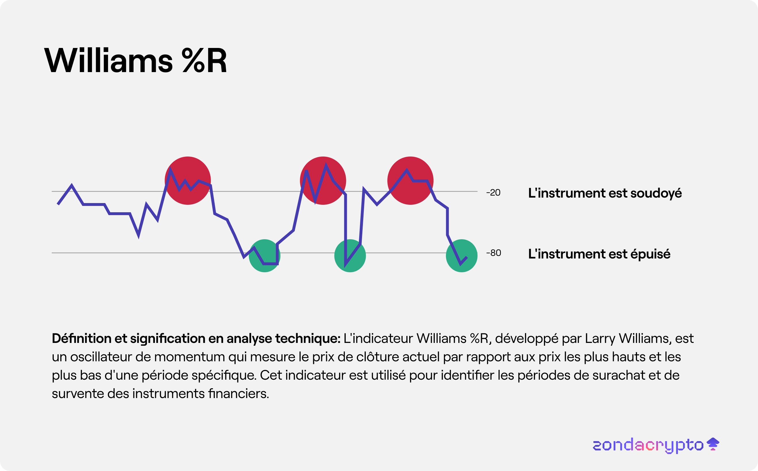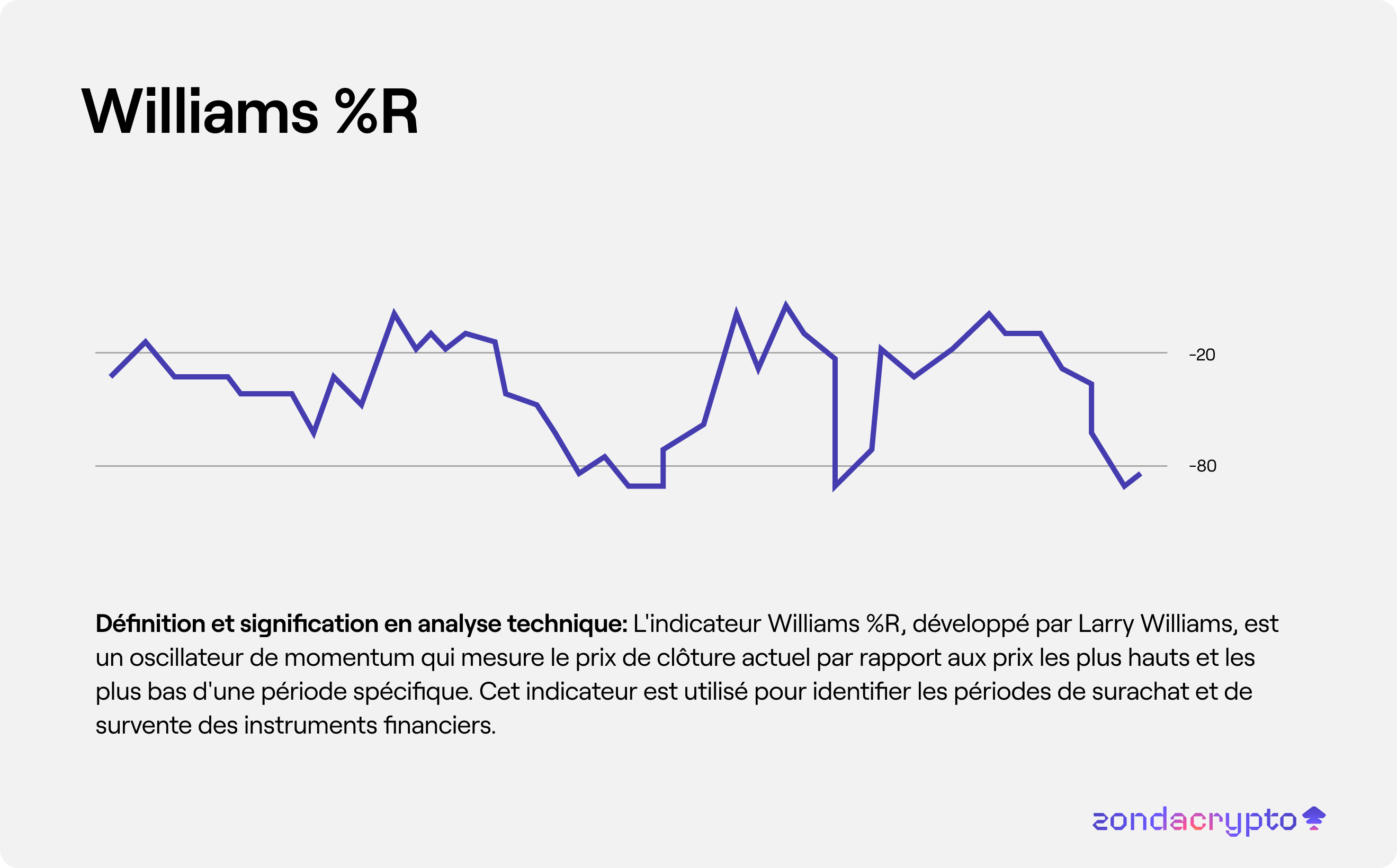 L'indicateur Williams %R, développé par Larry Williams, est un oscillateur de momentum qui mesure le prix de clôture actuel par rapport aux prix les plus hauts et les plus bas d'une période spécifique. Cet indicateur est utilisé pour identifier les périodes de surachat et de survente des instruments financiers.