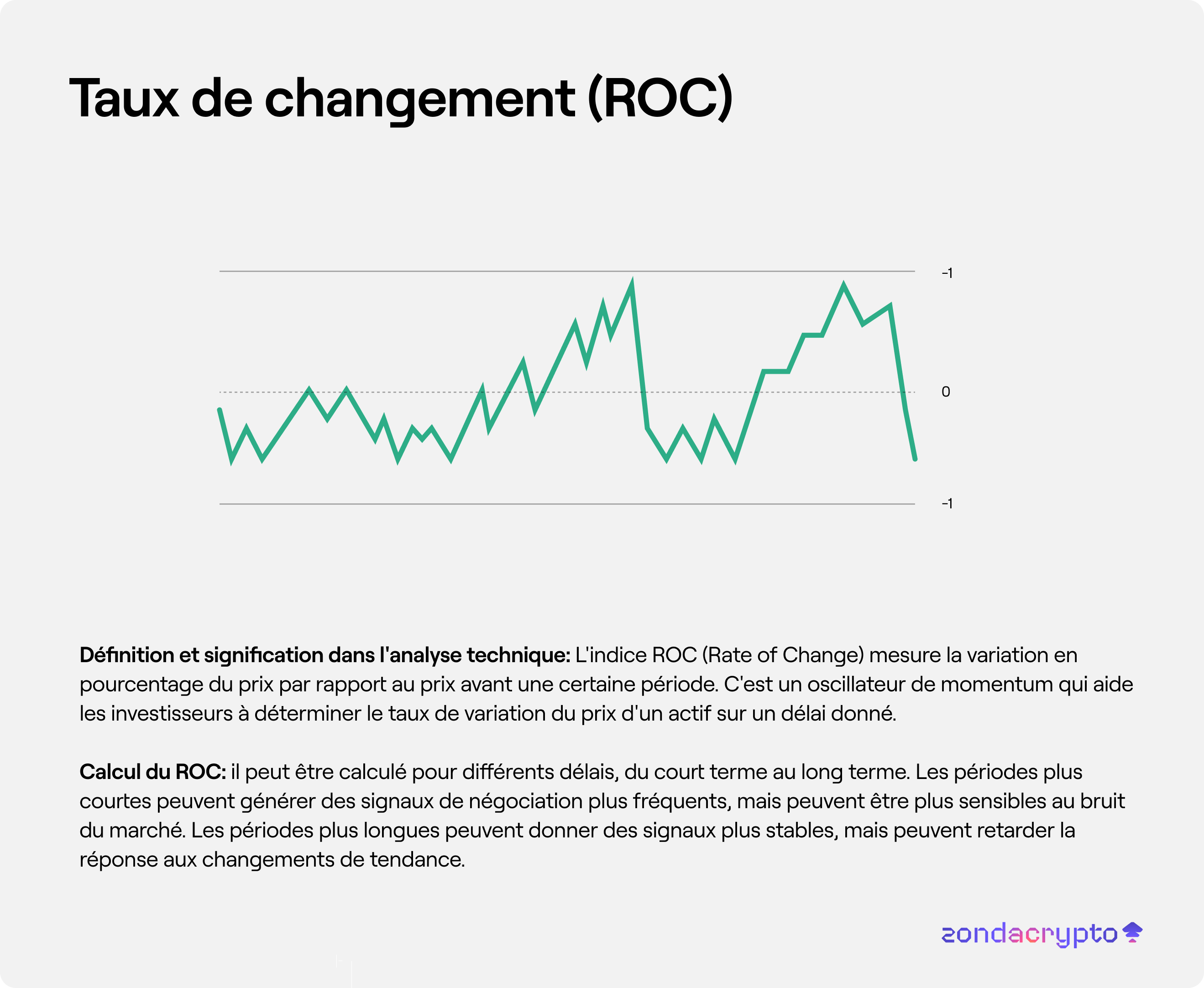 L'indice ROC (Rate of Change) mesure la variation en pourcentage du prix par rapport au prix avant une certaine période. C'est un oscillateur de momentum qui aide les investisseurs à déterminer le taux de variation du prix d'un actif sur un délai donné.