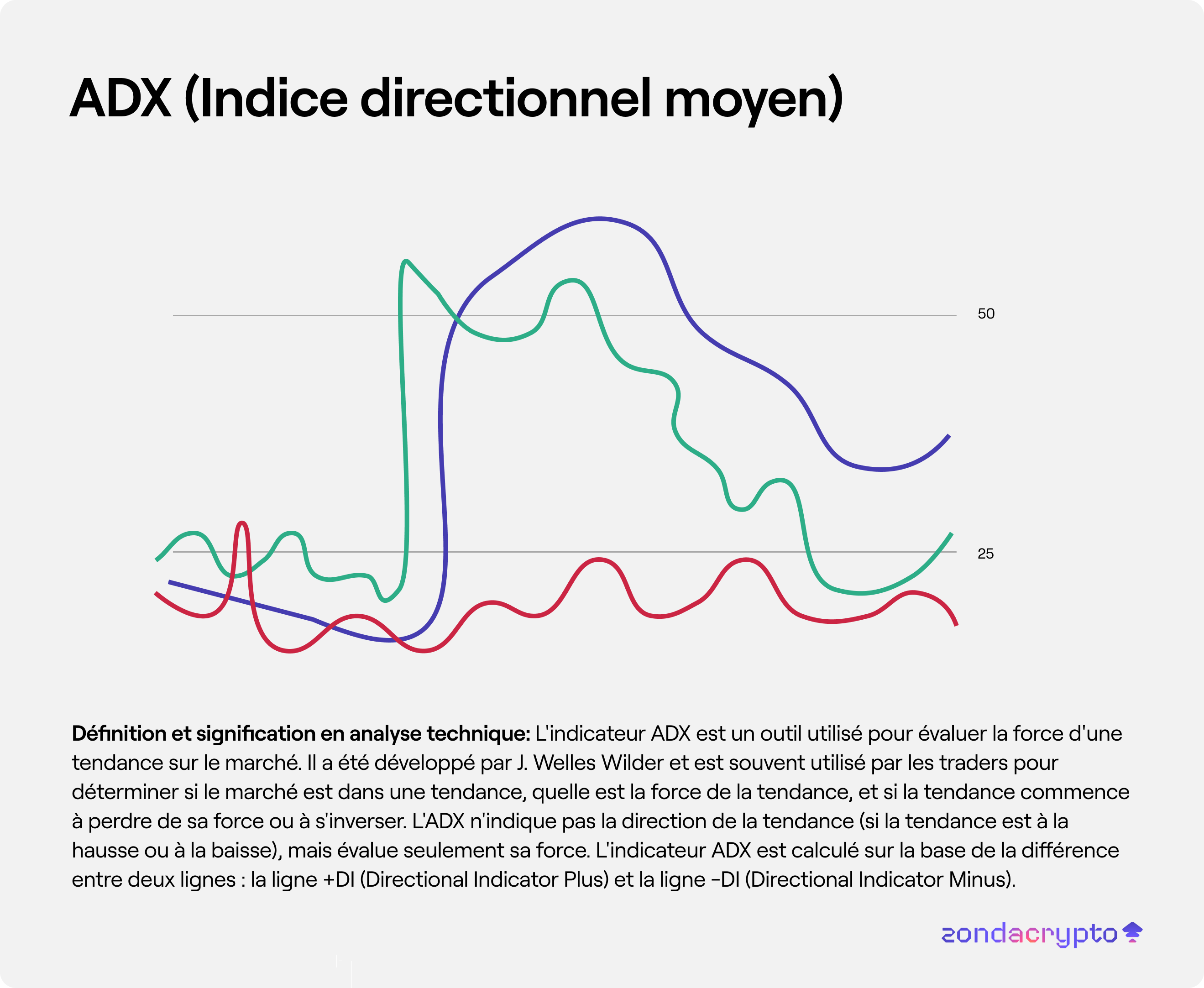 L'indicateur ADX est un outil utilisé pour évaluer la force d'une tendance sur le marché. Il a été développé par J. Welles Wilder et est souvent utilisé par les traders pour déterminer si le marché est dans une tendance, quelle est la force de la tendance, et si la tendance commence à perdre de sa force ou à s'inverser.