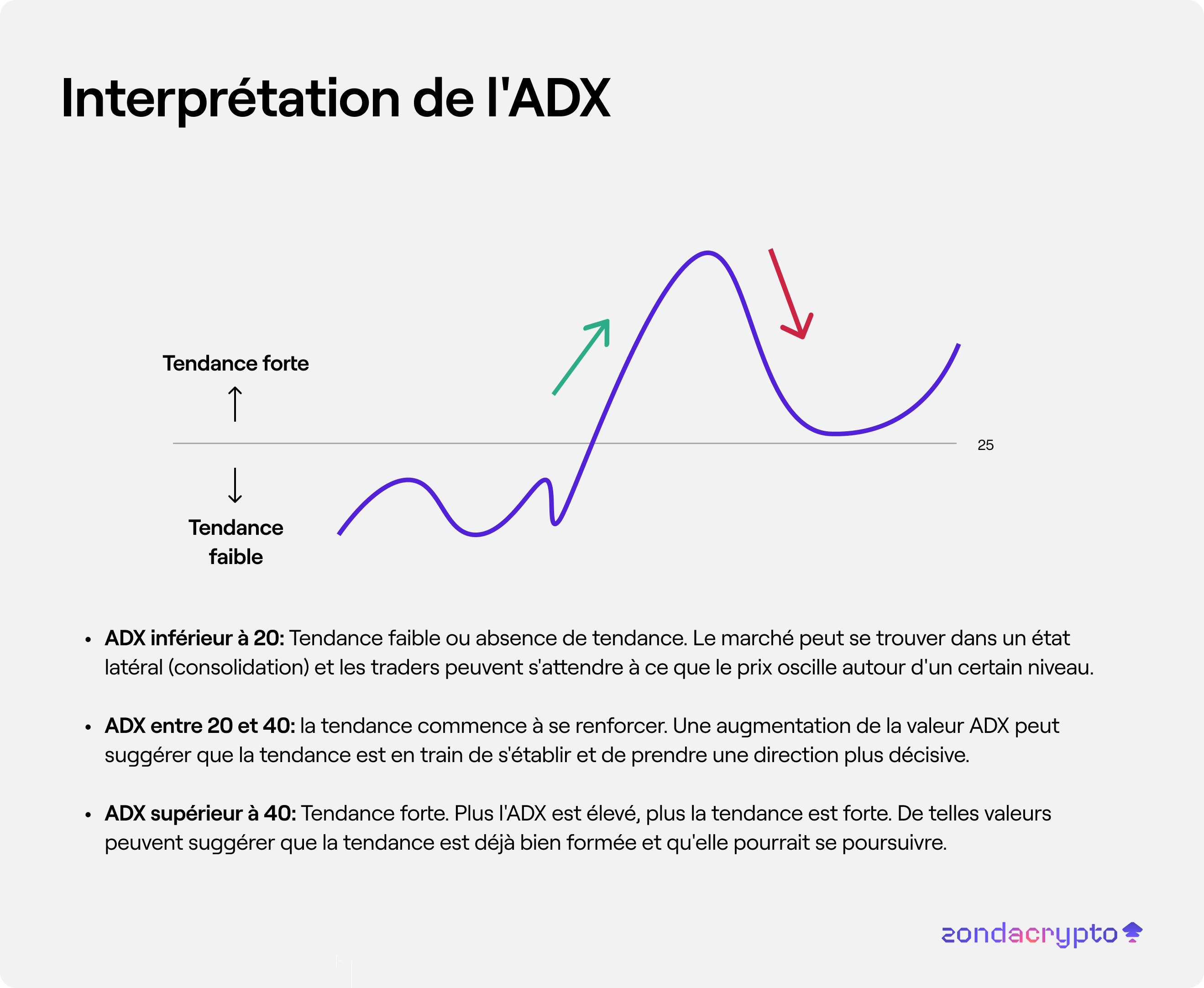 • ADX inférieur à 20: Tendance faible ou absence de tendance. Le marché peut se trouver dans un état latéral (consolidation) et les traders peuvent s'attendre à ce que le prix oscille autour d'un certain niveau.