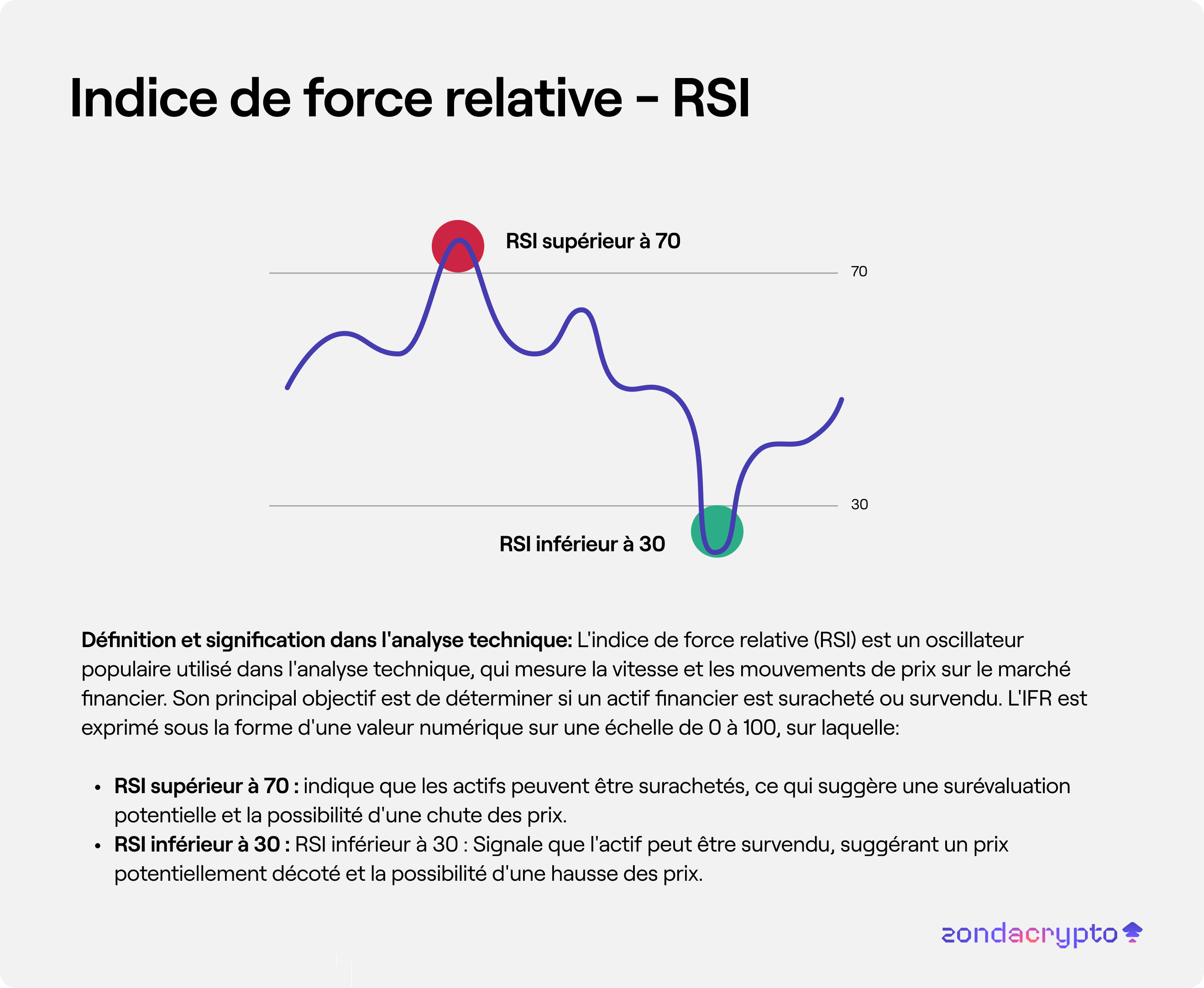 • RSI inférieur à 30 : RSI inférieur à 30 : Signale que l'actif peut être survendu, suggérant un prix potentiellement décoté et la possibilité d'une hausse des prix.