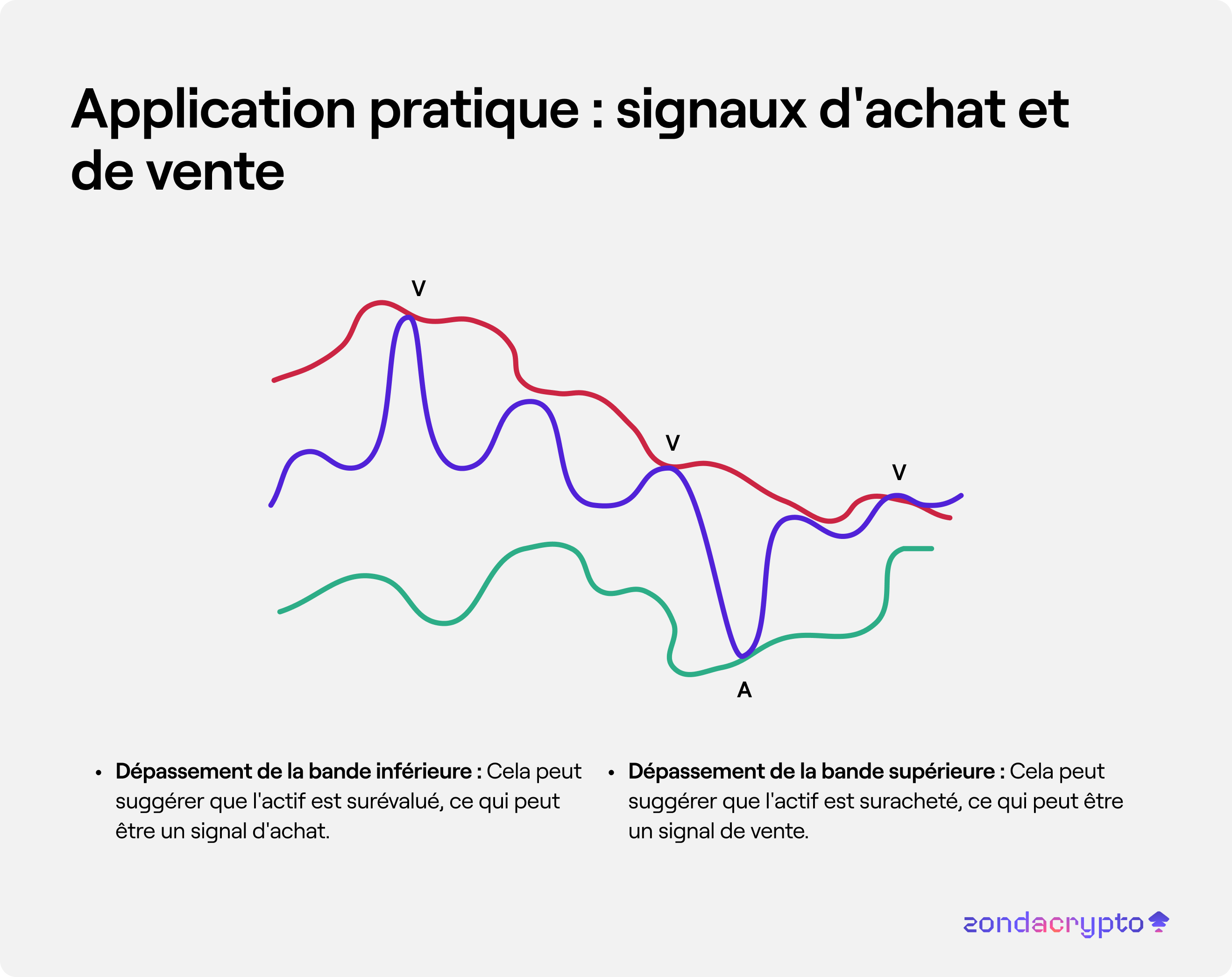 • Dépassement de la bande supérieure : Cela peut suggérer que l'actif est suracheté, ce qui peut être un signal de vente.