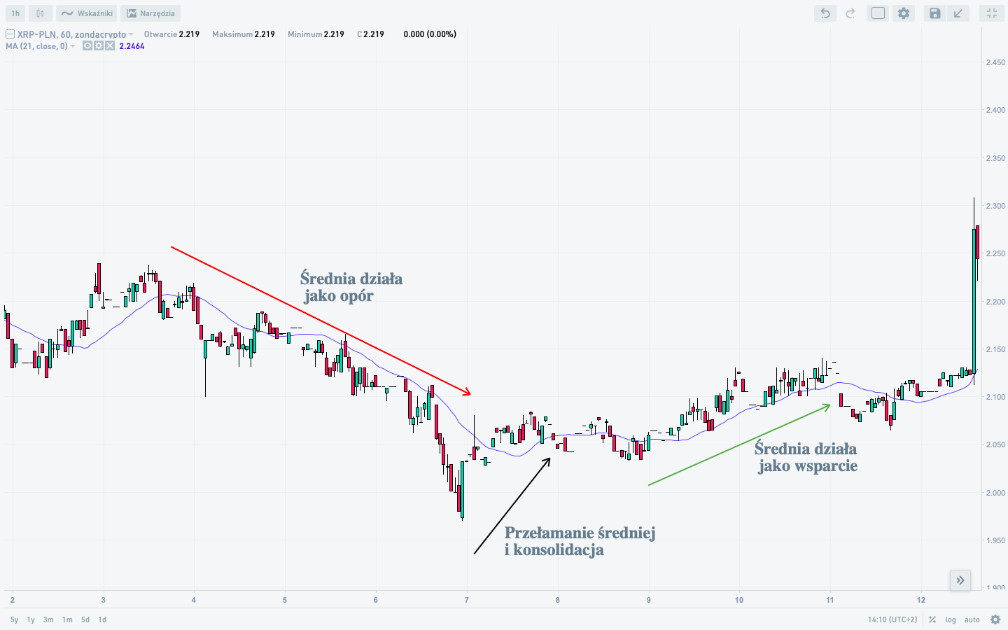 Le graphique ci-dessous montre l'utilisation de la moyenne mobile simple (SMA) sur un autre marché cryptographique. Comme vous pouvez le voir, la SMA agit comme un niveau de résistance et lorsqu'elle est franchie, elle commence à agir comme un support.