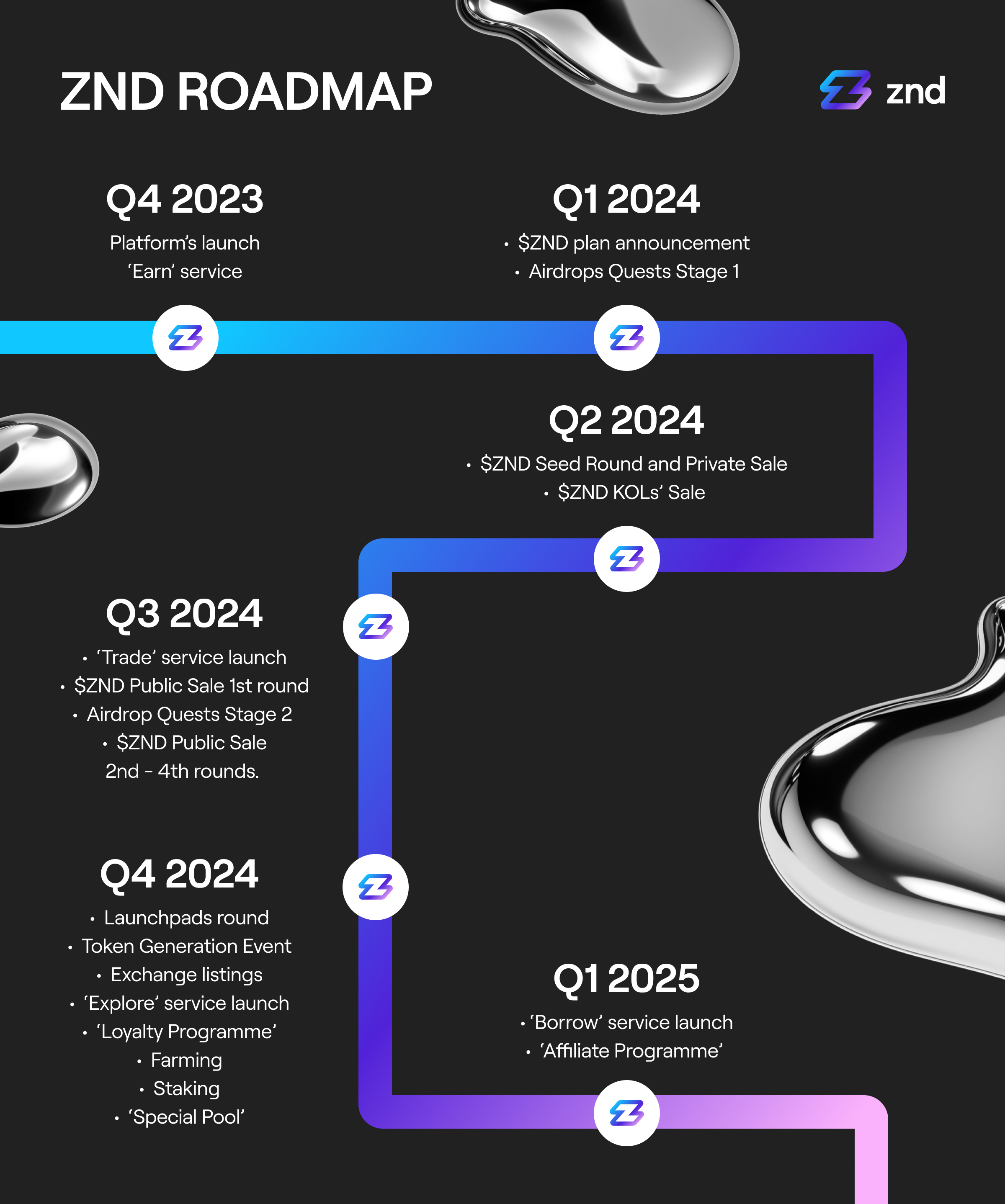 Nous avons organisé notre première campagne d'airdrop, au cours de laquelle les membres les plus actifs de la communauté ont eu l'opportunité de recevoir des jetons rZND en récompense, qui seront échangés contre des ZND à l'avenir. Nous avons publié notre livre blanc, qui a été préparé avec le plus grand soin afin d'être totalement conforme aux réglementations MiCA à venir. En outre, nous avons publié un Gitbook, qui contient des informations très détaillées sur tous les aspects du projet ZND.