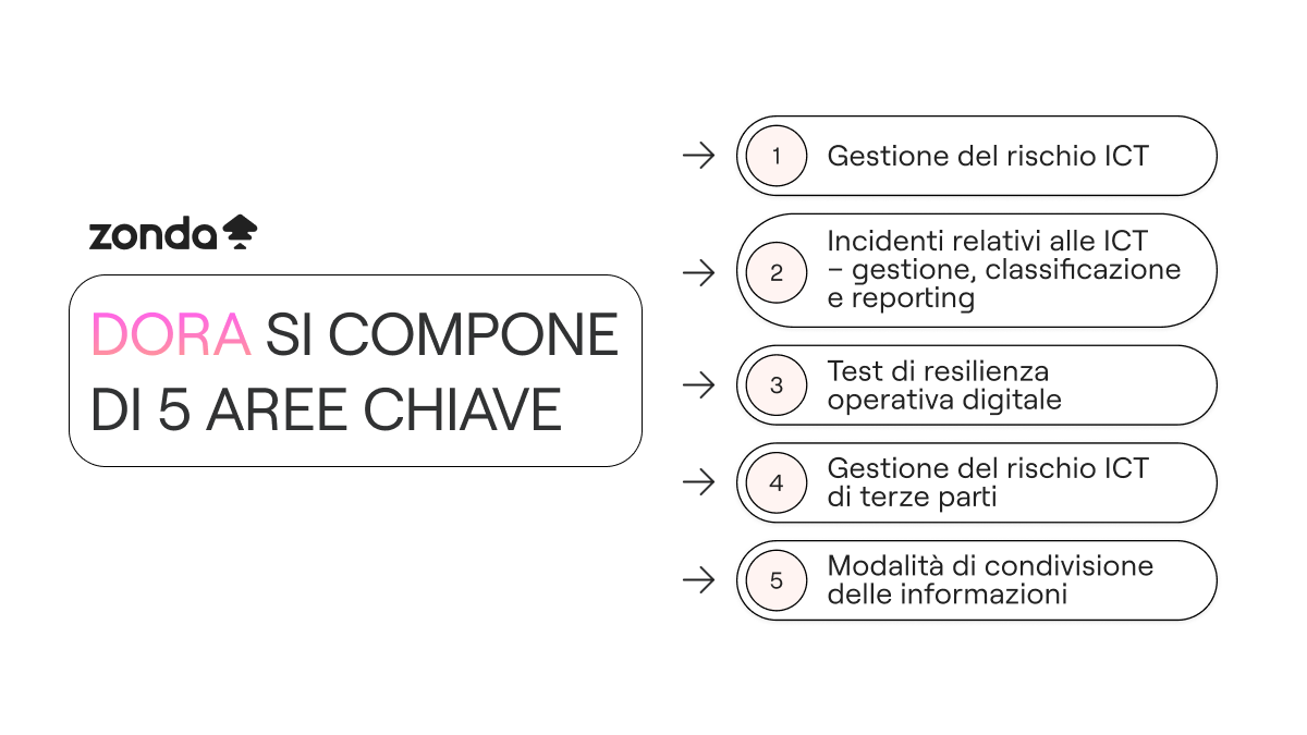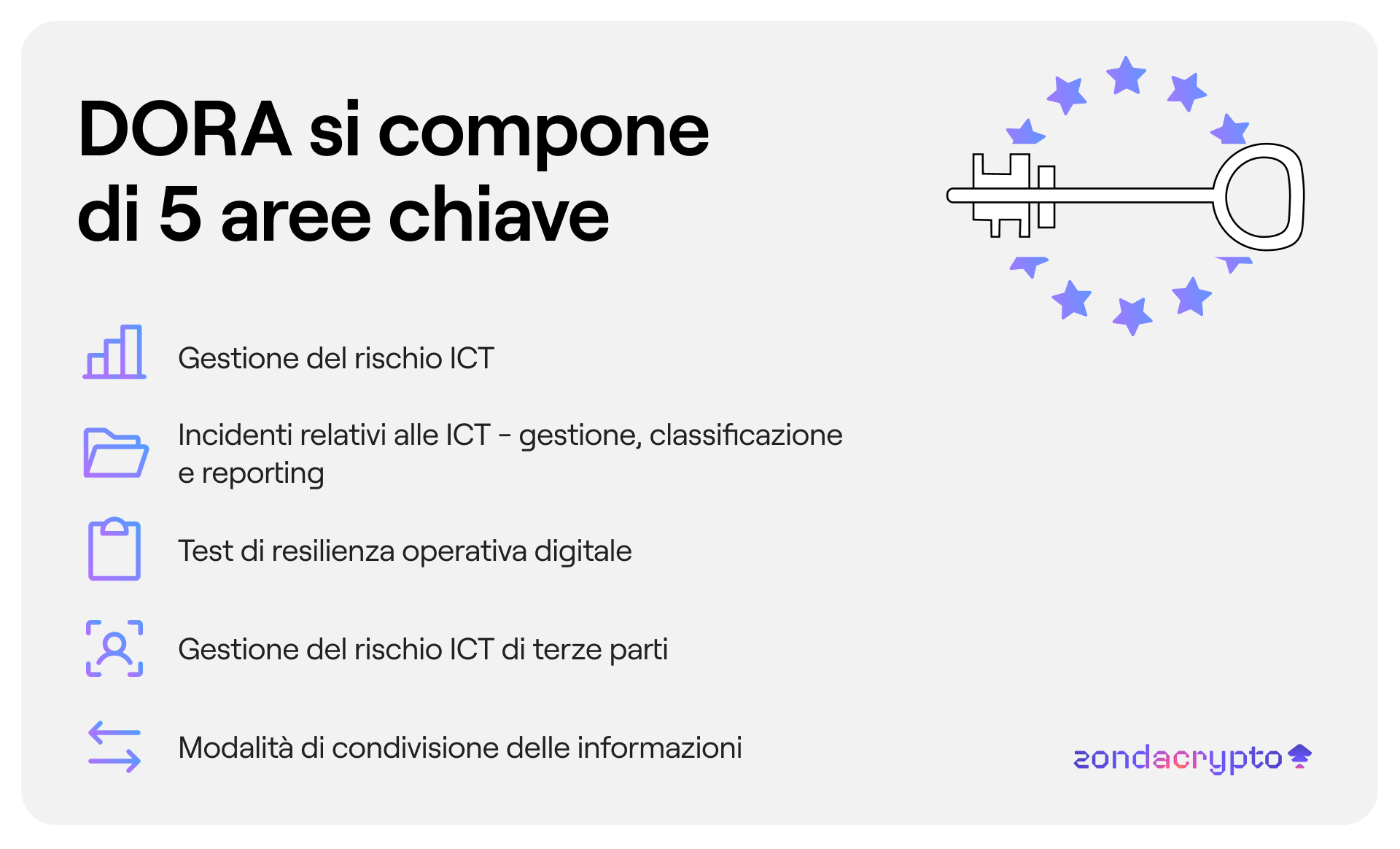 All'interno di ciascuna delle aree chiave, DORA richiede alle entità finanziarie di rispettare una serie di requisiti in relazione a vari aspetti all'interno dell'ICT e della sicurezza digitale. Pertanto, fornisce un quadro completo* per la resilienza digitale delle entità finanziarie.