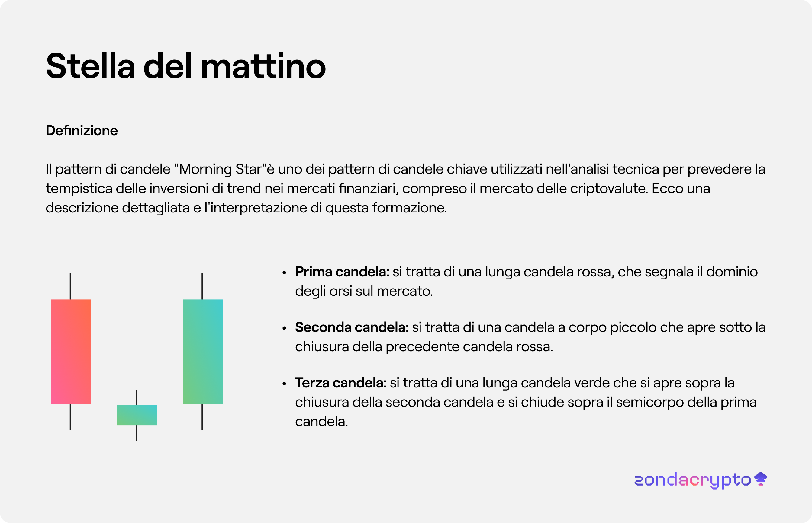 Il pattern di candele "Morning Star"è uno dei pattern di candele chiave utilizzati nell'analisi tecnica per prevedere la tempistica delle inversioni di trend nei mercati finanziari, compreso il mercato delle criptovalute. Ecco una descrizione dettagliata e l'interpretazione di questa formazione.