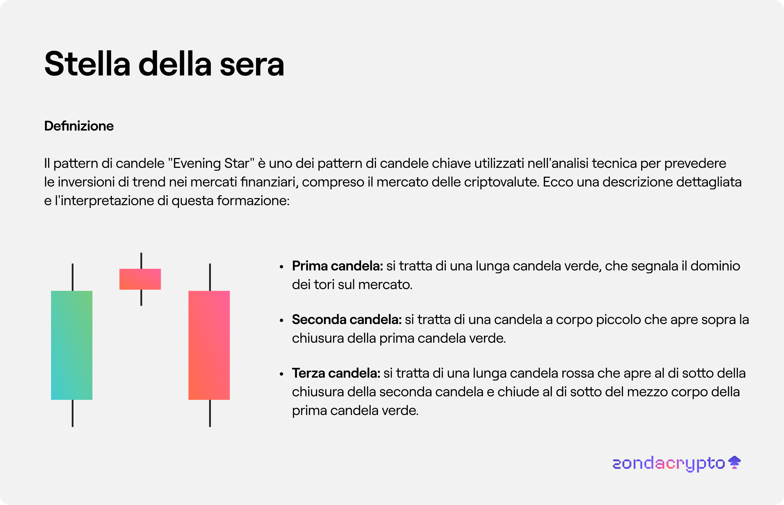 Il pattern di candele "Evening Star" è uno dei pattern di candele chiave utilizzati nell'analisi tecnica per prevedere le inversioni di trend nei mercati finanziari, compreso il mercato delle criptovalute. Ecco una descrizione dettagliata e l'interpretazione di questa formazione: