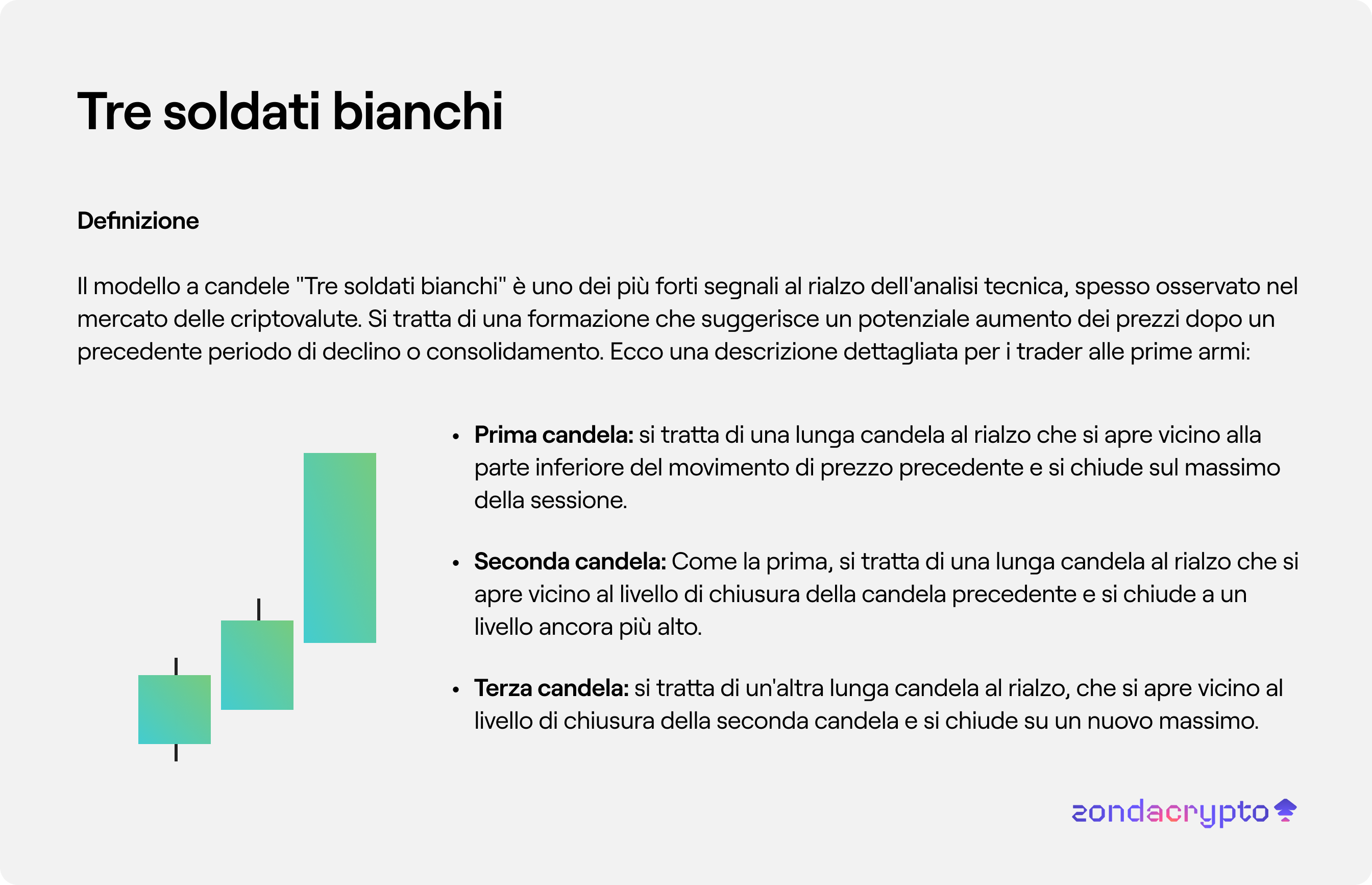 Il modello a candele "Tre soldati bianchi" è uno dei più forti segnali al rialzo dell'analisi tecnica, spesso osservato nel mercato delle criptovalute. Si tratta di una formazione che suggerisce un potenziale aumento dei prezzi dopo un precedente periodo di declino o consolidamento. Ecco una descrizione dettagliata per i trader alle prime armi: