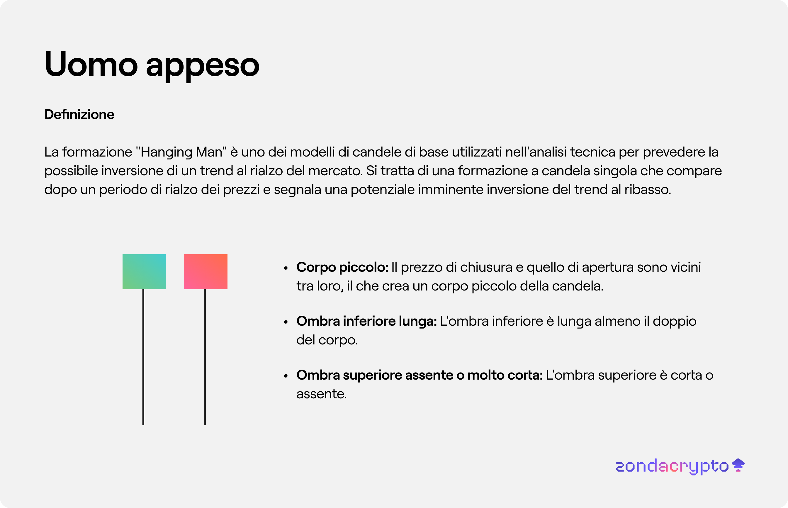 La formazione "Hanging Man" è uno dei modelli di candele di base utilizzati nell'analisi tecnica per prevedere la possibile inversione di un trend al rialzo del mercato. Si tratta di una formazione a candela singola che compare dopo un periodo di rialzo dei prezzi e segnala una potenziale imminente inversione del trend al ribasso.