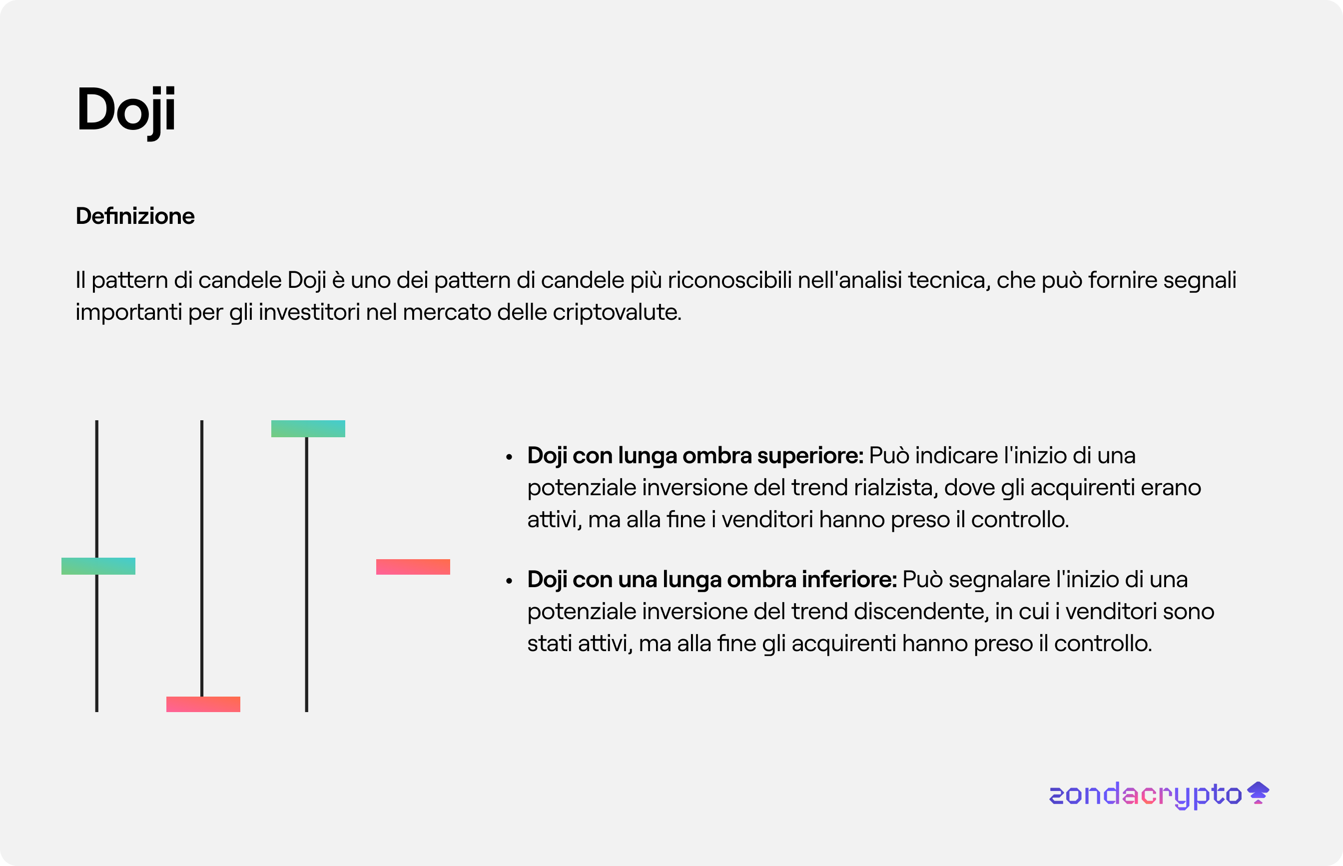 Il pattern di candele Doji segnala un equilibrio tra domanda e offerta e l'incertezza del mercato. Le principali interpretazioni includono: